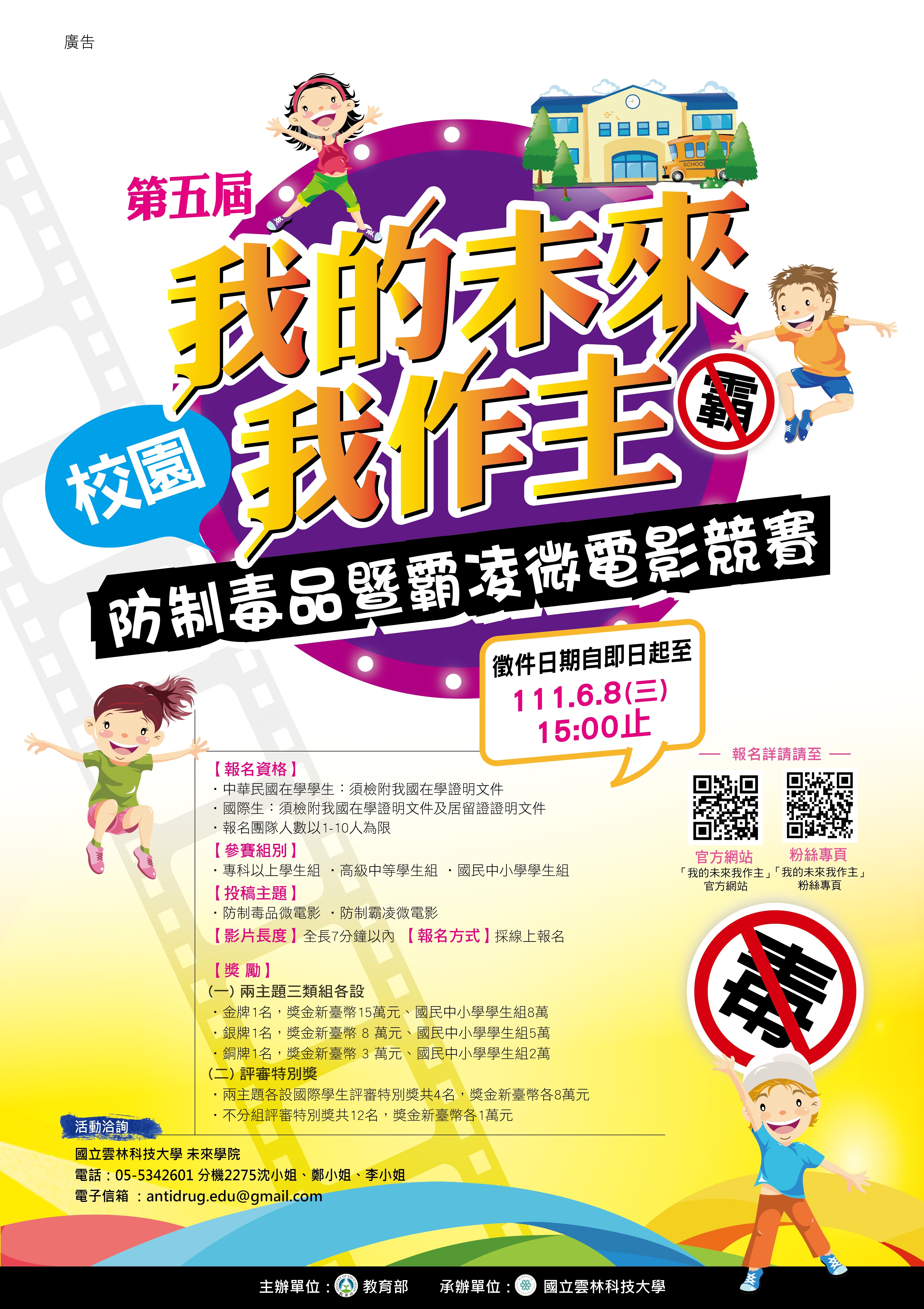 二、詳細競賽資訊請見「我的未來我作主」官方網站(www.antidrug.tw/)、臉書粉絲專頁(www.facebook.com/antidrug.edu/),或洽詢承辦單位,電話:(05)534-2601#2275。