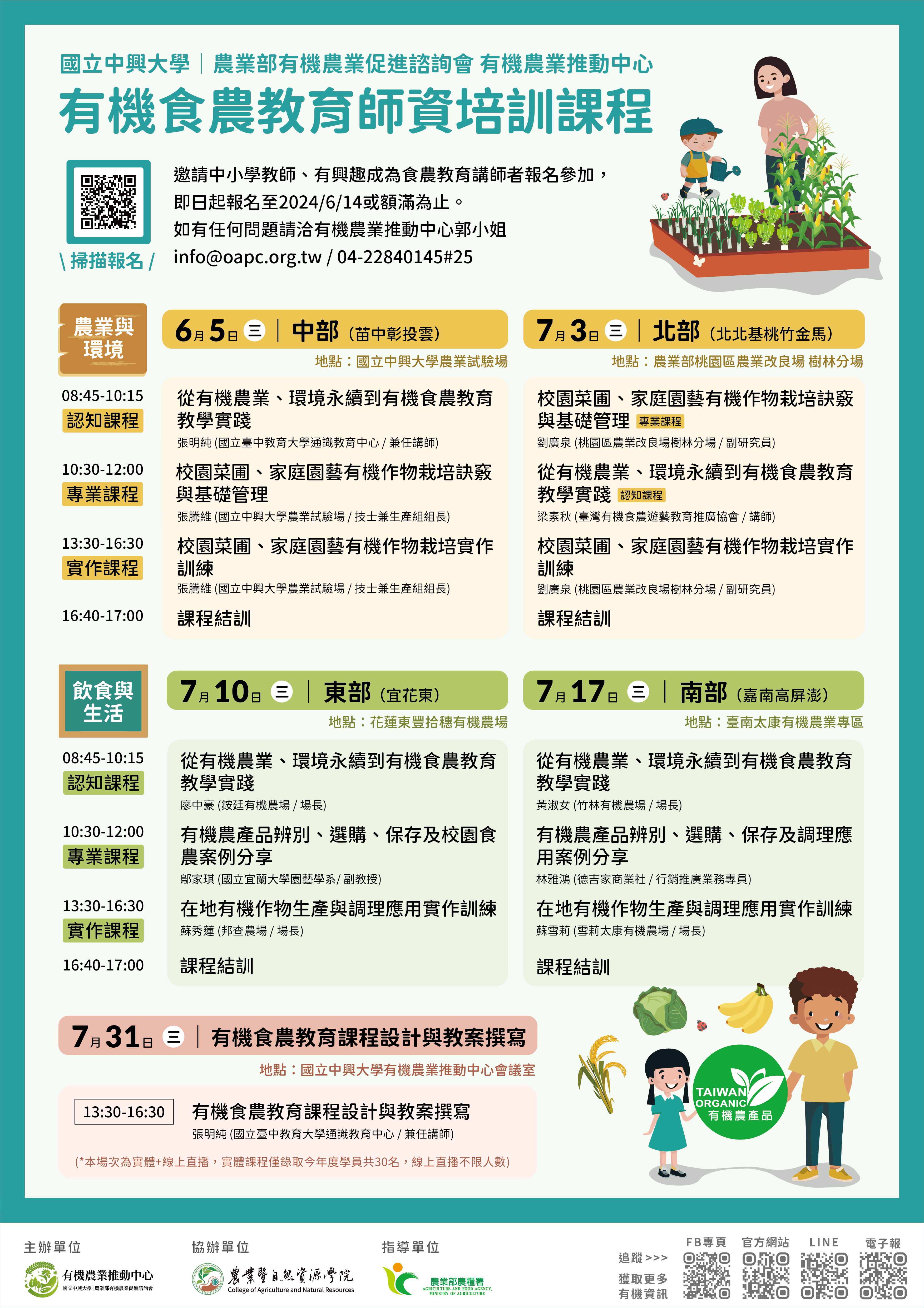(五)113年7月31日(星期三)13:30-16:30,「有機食農教育 課程設計與教案撰寫」(實體暨線上直播),課程地 點:國立中興大學有機農業推動中心會議室。