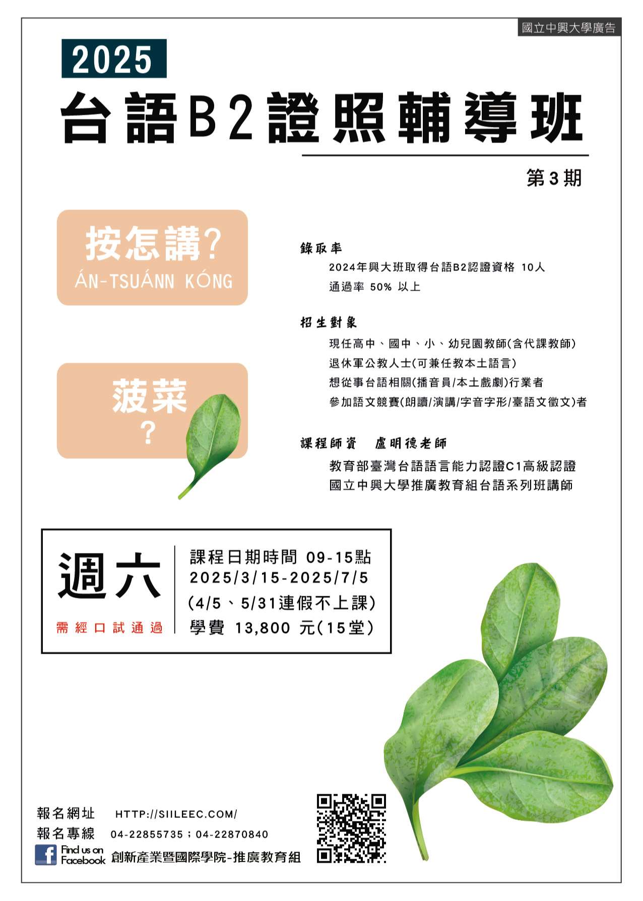 中興大學「台語B2證照輔導班第3期」招生簡章