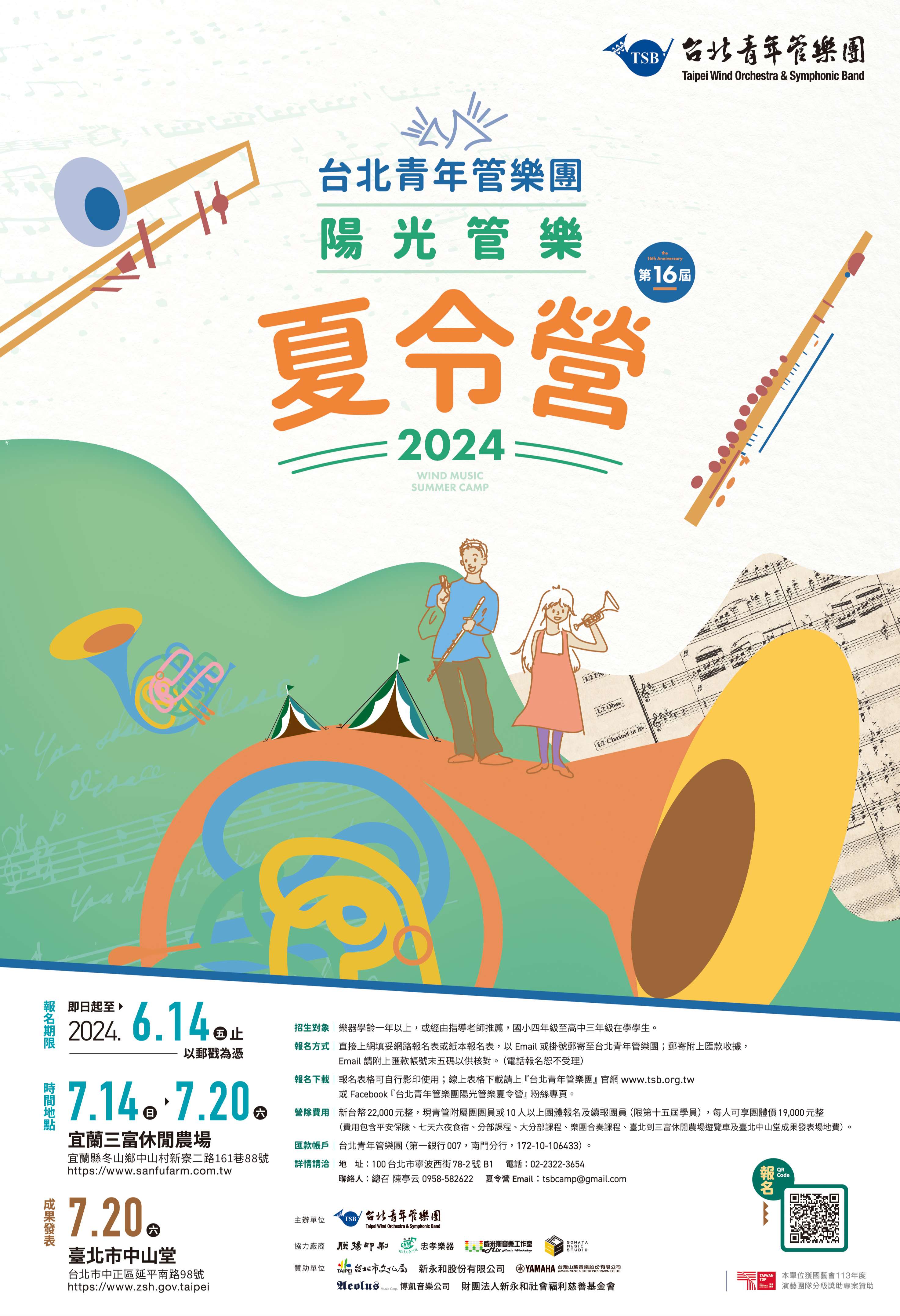 一、台北青管暑假最受歡迎的陽光管樂夏令營,聘請專業師 資,規劃豐富充實課程,並規劃於113年7月20日(六)下 午2點30分假臺北市中山堂中正廳舉辦成果發表會,歡迎喜 愛管樂演奏學生踴躍報名參加。