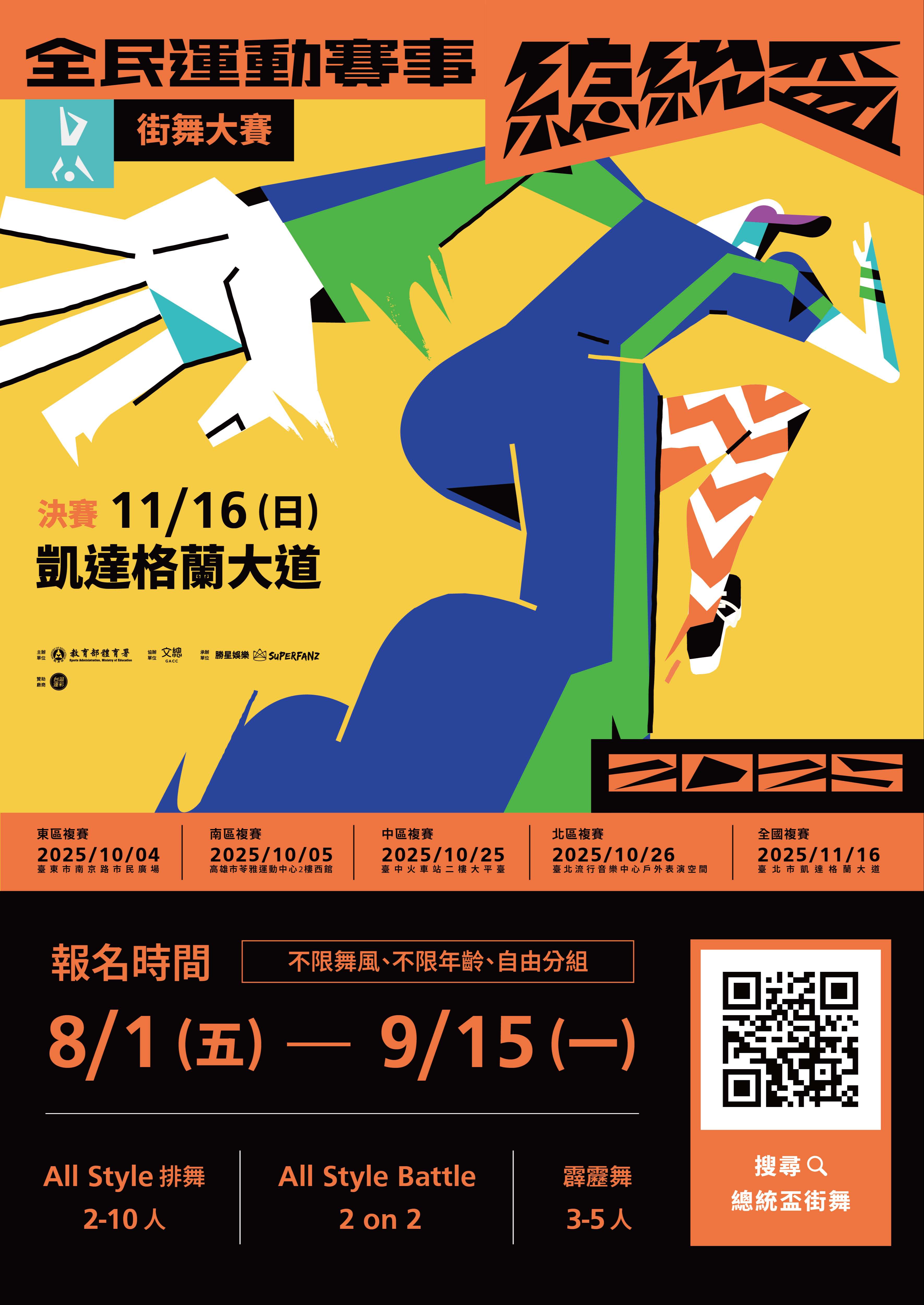 一、為配合運動部掛牌成立,推展全民運動、競技運動全民化 政策及擴大推廣街舞文化,本署首度舉辦「2025 總統盃全 民運動賽事—街舞大賽」,本賽事採全國性競賽形式,分 為線上海選、四區實體複賽及總決賽三階段,共同角逐街 舞最高榮譽。