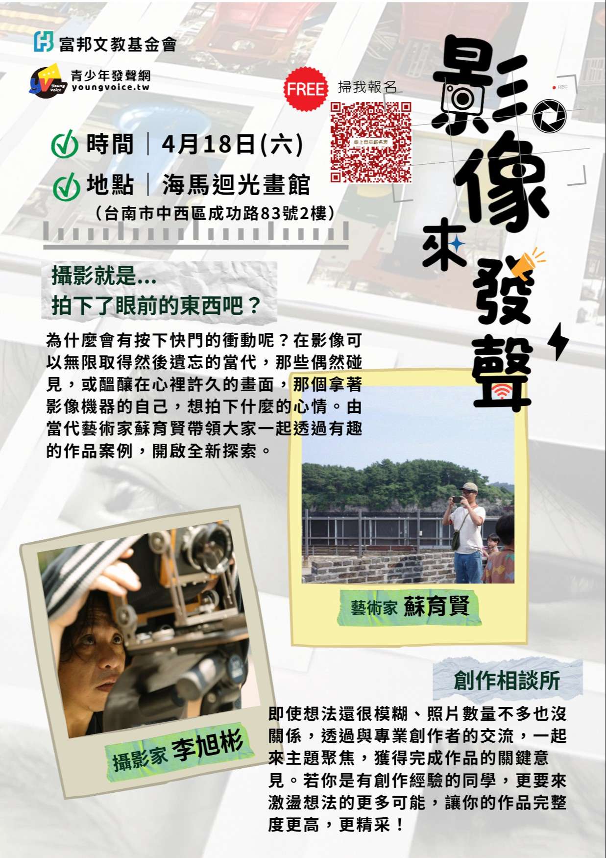 四、活動全程免費,採網路報名(線上報名簡章: https://reurl.cc/qpZk4D),活動將於四月於台北、台 中、台南陸續辦理,對象為15至19歲青少年,敬請貴校協助公告本活動資訊,並鼓勵對攝影與視覺創作有興趣之學 生踴躍參與。