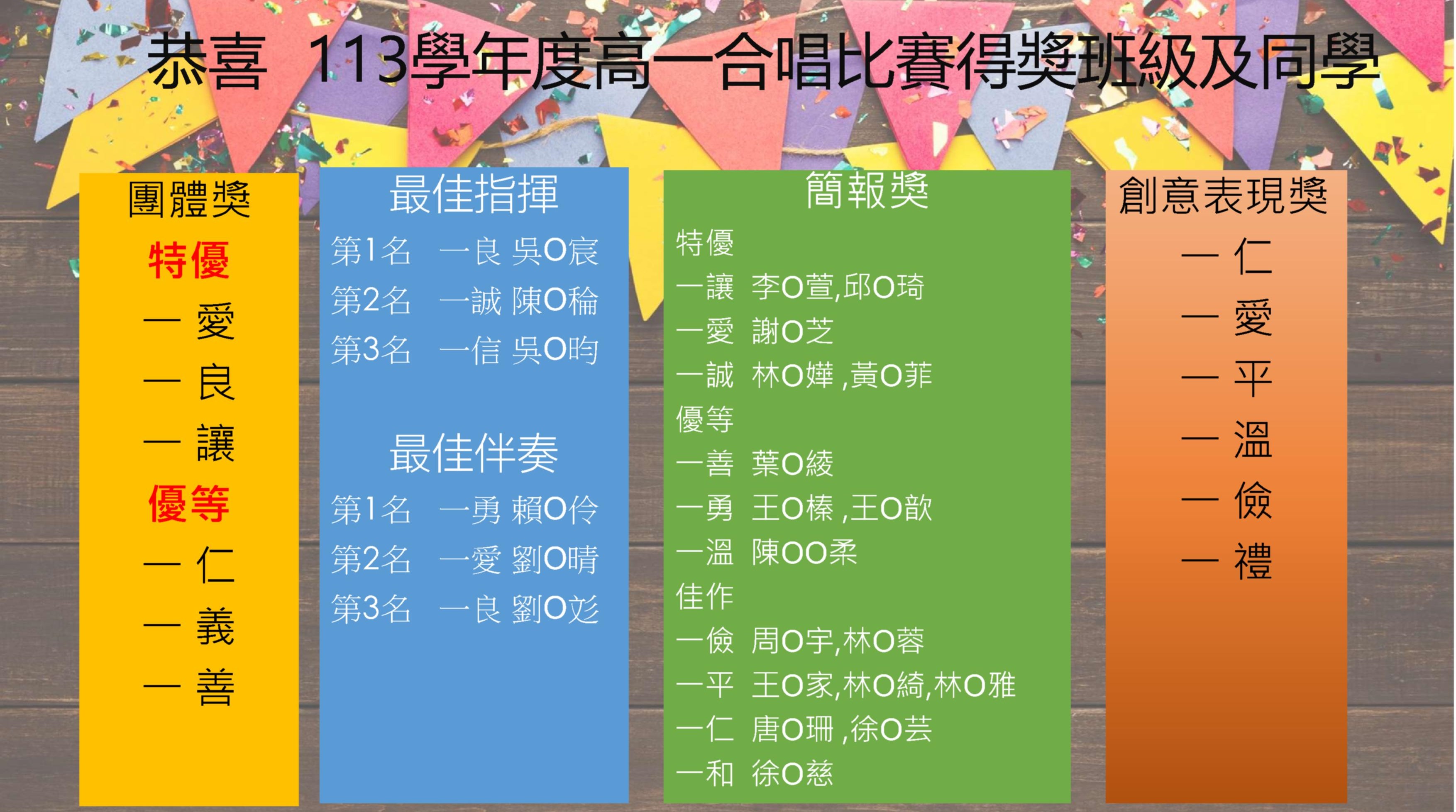 恭喜~~獲得113學年度高一合唱比賽班級及同學,感謝 楊靜欣老師 及 劉安莉老師 用心的指導 !!