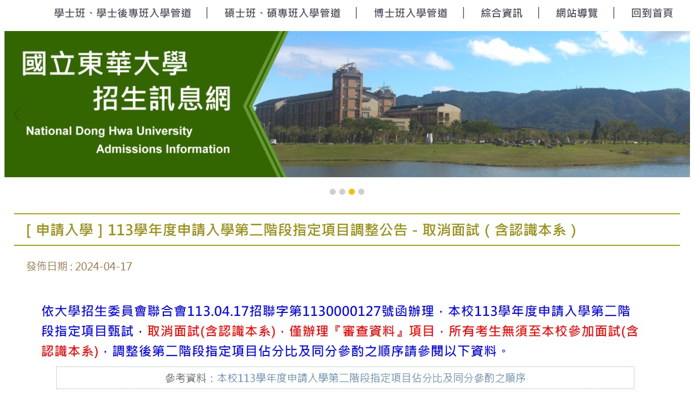 一、國立東華大學113學年度申請入學第二階段指定項目甄試,各學系皆取消面試(含認識本系),僅辦理『審查資料』項目,所有考生無須至該校參加面試(含認識本系)。