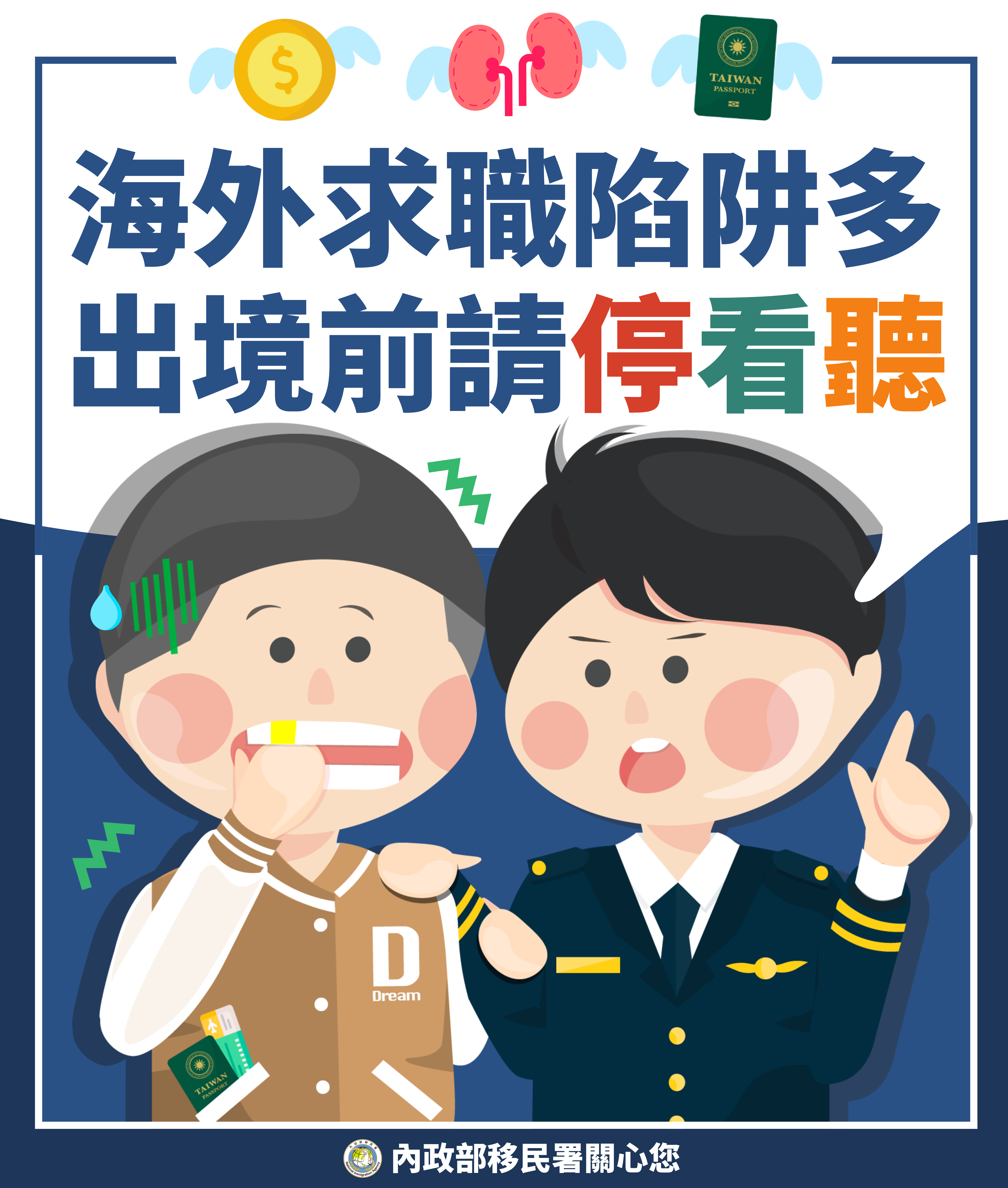 (二)內政部移民署防詐宣導海報「海外求職陷阱多出境前請 停看聽」等3款JPG/PNG檔,如需印製AI檔,請逕洽該署 承辦人(專員柯淑華,電話:02-23889393轉2545)。 (三)內政部移民署每年透過多元方式向國人及外來人口進行 人口販運防制宣導,相關文宣圖檔放置於該署官網(網 址: https://www.immigration.gov.tw)之「防制人口 販運專區」之「下載專區」,可供瀏覽運用。