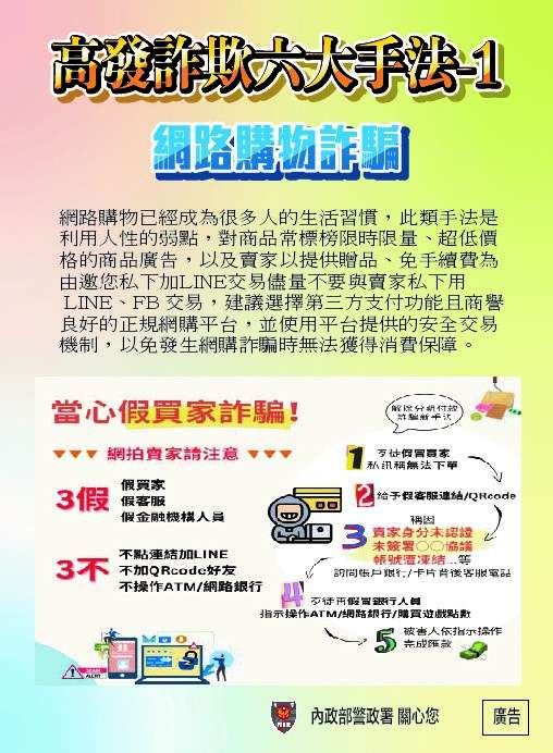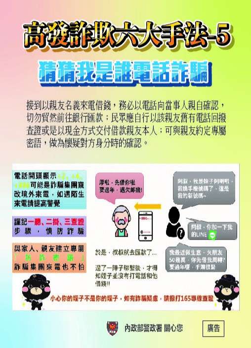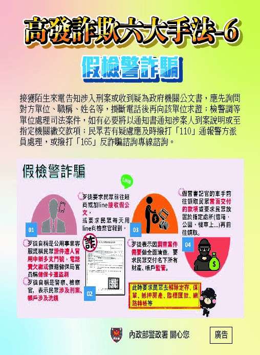 二、本案影片檔總計10部,Google雲端連結9部,youtube連結1 部(如附件1),宣導圖文6張(如附件2~7),推播期程為1個月(可視各機關單位規定自行安排調整),惠請共同響應推廣,運用各式宣導管道推播行銷,提升國人防詐免疫力。