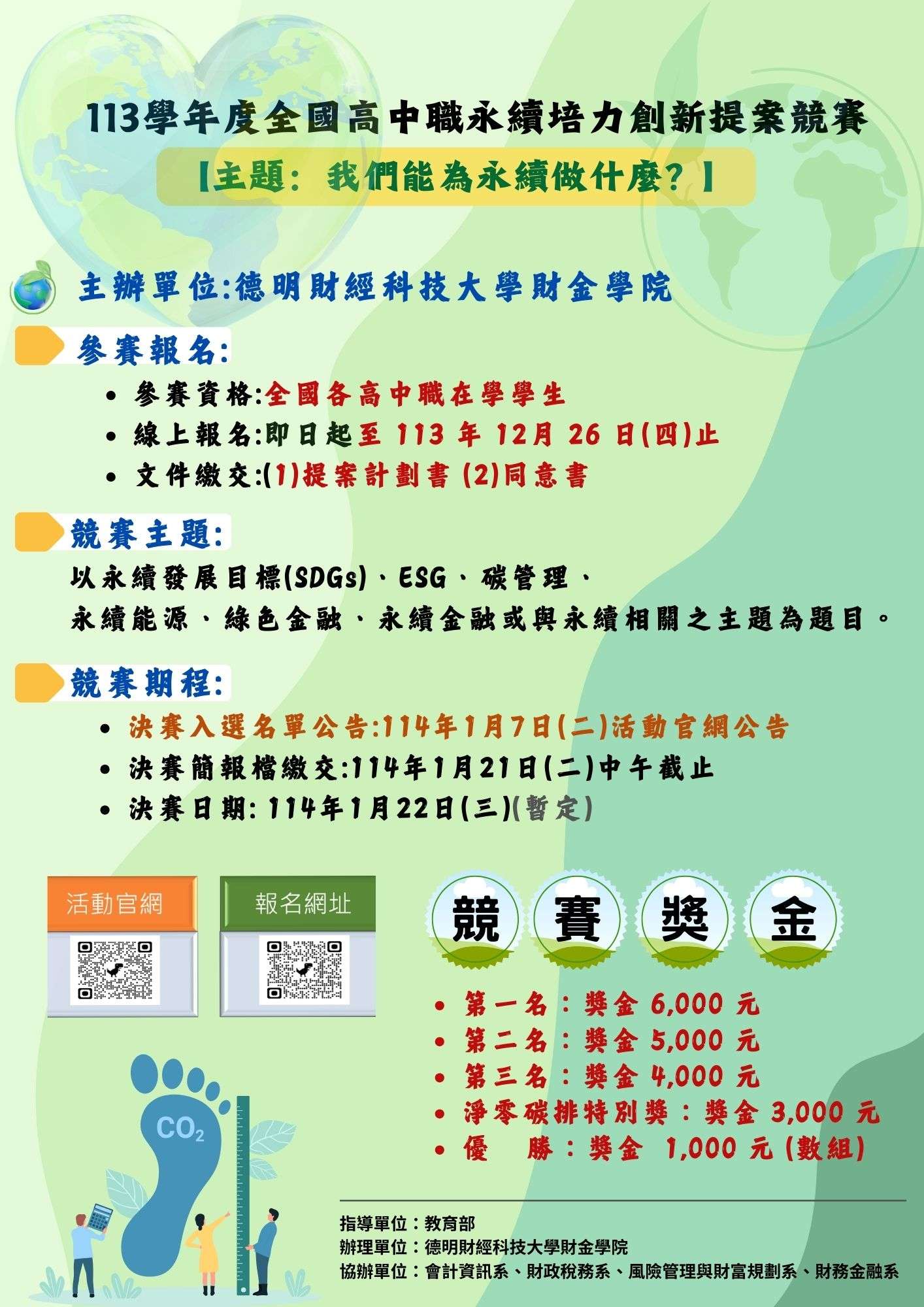 一、為鼓勵學生能關心與覺察社會、環境、企業經營及永續金 融等各項永續發展議題,本校財金學院辦理「我們能為永 續發展做什麼?」永續培力創新提案競賽,藉由競賽提案過 程,激發學生的創意發想,提出如何實現更加永續美好未 來的可能解決方案。