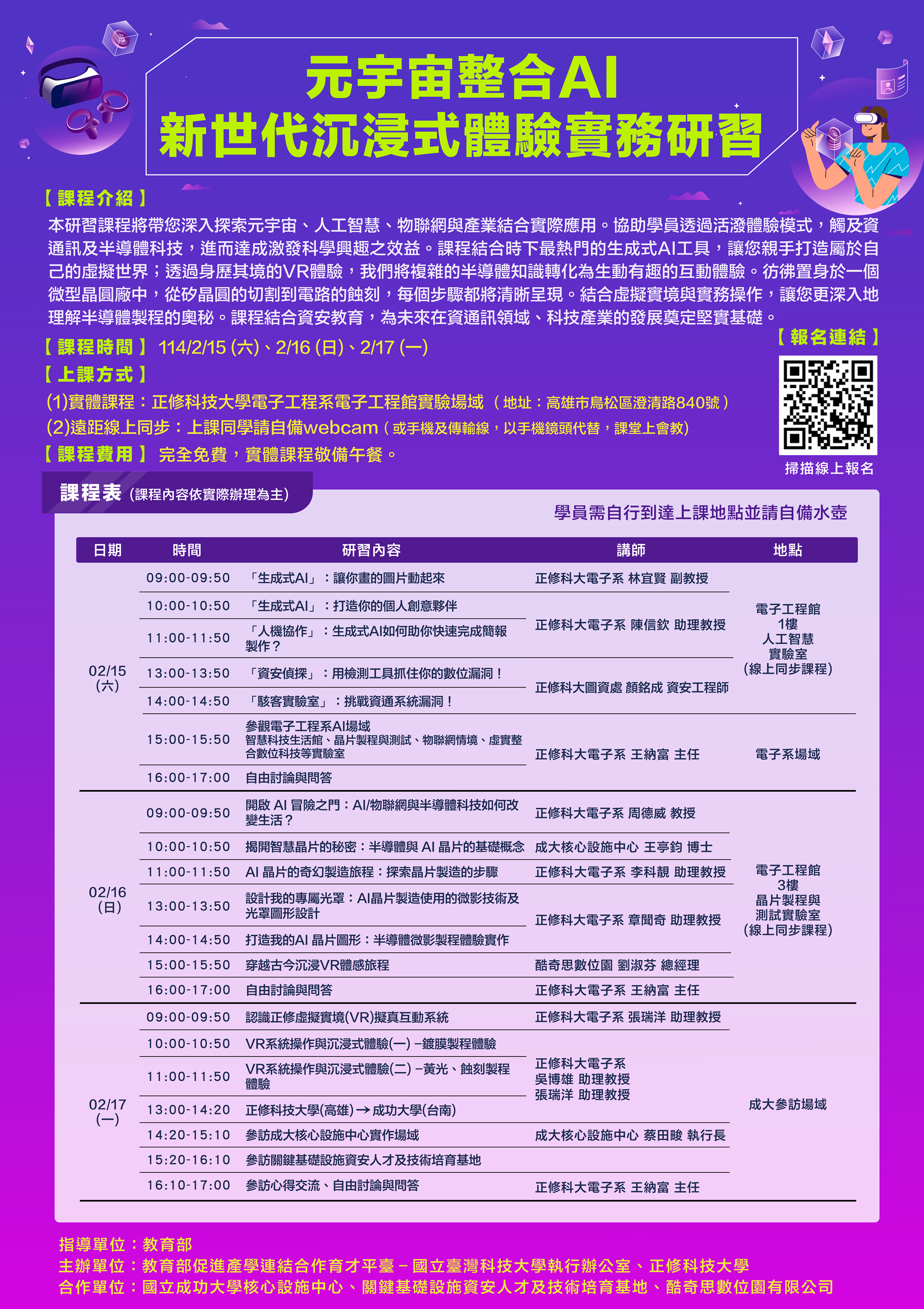 一、檢送「元宇宙整合AI-新世代沉浸式體驗實務研習」說明乙份,請依規定於期限內完成報名。 二、線上報名連結:https://forms.gle/2Bnspi537dGZLG2T9
