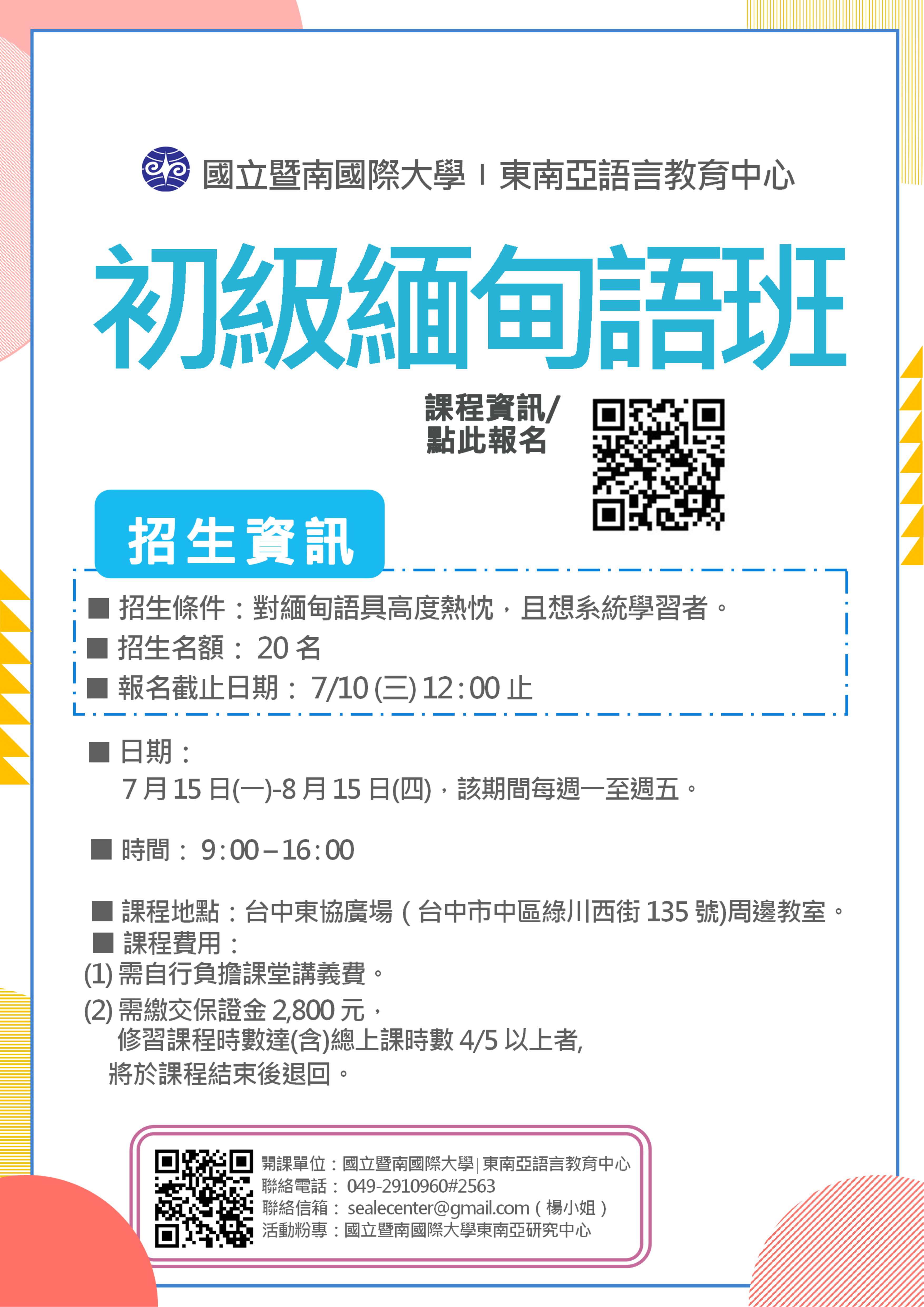 國立暨南國際大學為培育東南亞語言人才,本校東南亞語言教育中心訂於 108年7月15日起假臺中市東協廣場(臺中市中區綠川西街 135號)周邊教室辦理「108年度初級緬甸語課程」