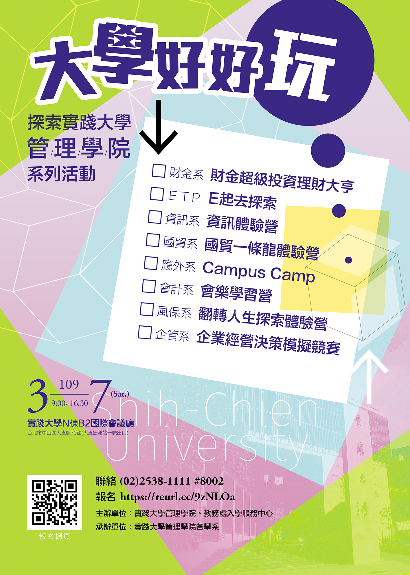 二、活動相關資訊如下: (一)時間:109年3月7日(星期六)上午9時至下午4時30分。 (二)地點:本校臺北校本部圖資大樓地下2樓國際會議廳(校 區近捷運文湖線大直站1號出口)。 (三)報名方式:採線上報名,網址:https://Reurl.cc /9zNLOa。 (四)報名時間:自即日起至109年2月28日(星期五)下午5時 止。 (五)費用:活動免費,並發予研習證書。