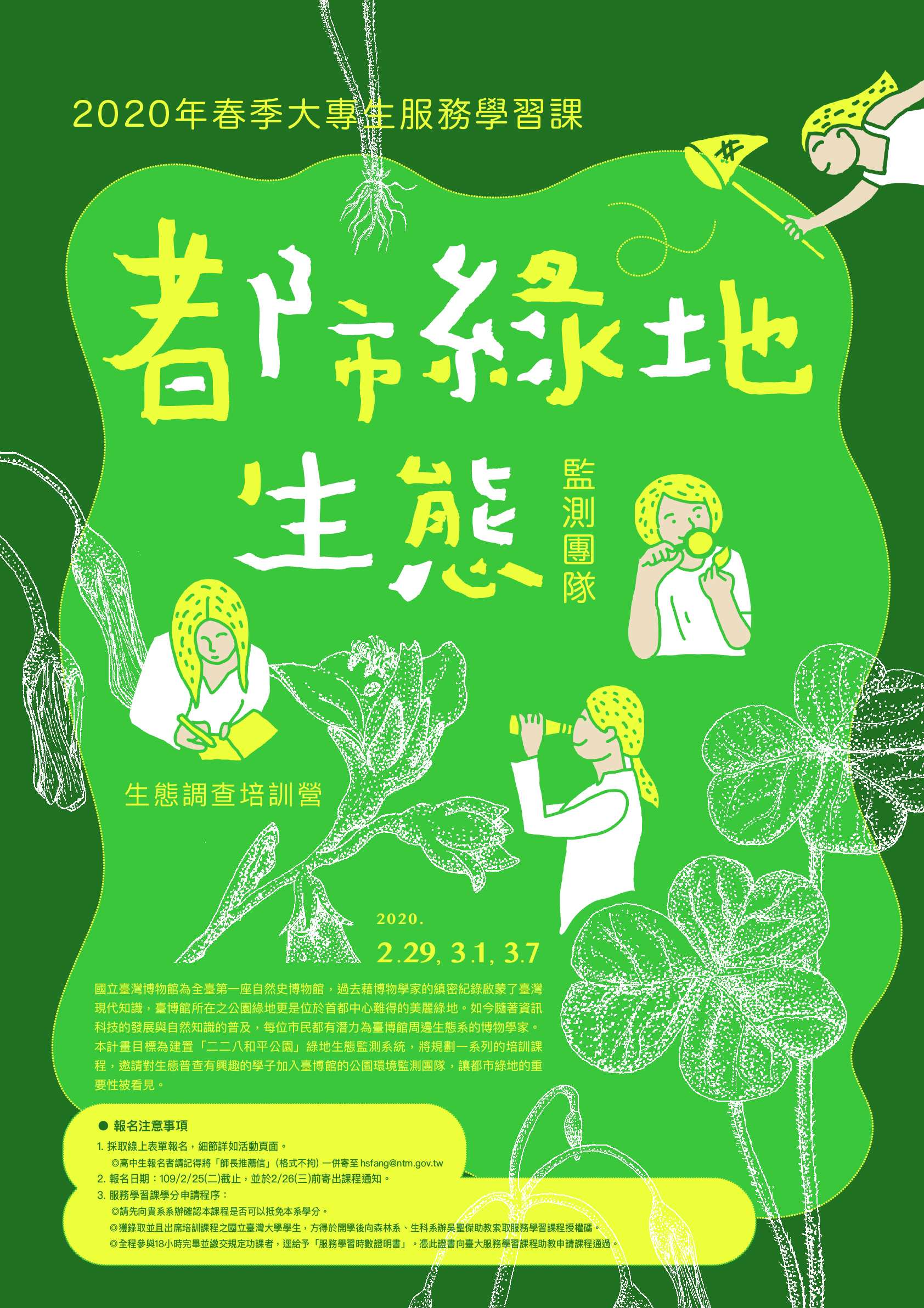 一、為呼應2020生物多樣性超級年、世界地球日50週年,本館 以公民科學為主題推廣生物多樣性與永續發展,延續「都 市綠地生態監測團隊」為主題規劃生態調查與生態解說培 訓課程,招募對自然生態與環境議題有興趣的高中與大專 院校學生加入都市博物學家行列,預計109年2月29、3月1 日、7日辦理培訓課程,後續進一步參與後續科學調查與導覽活動。