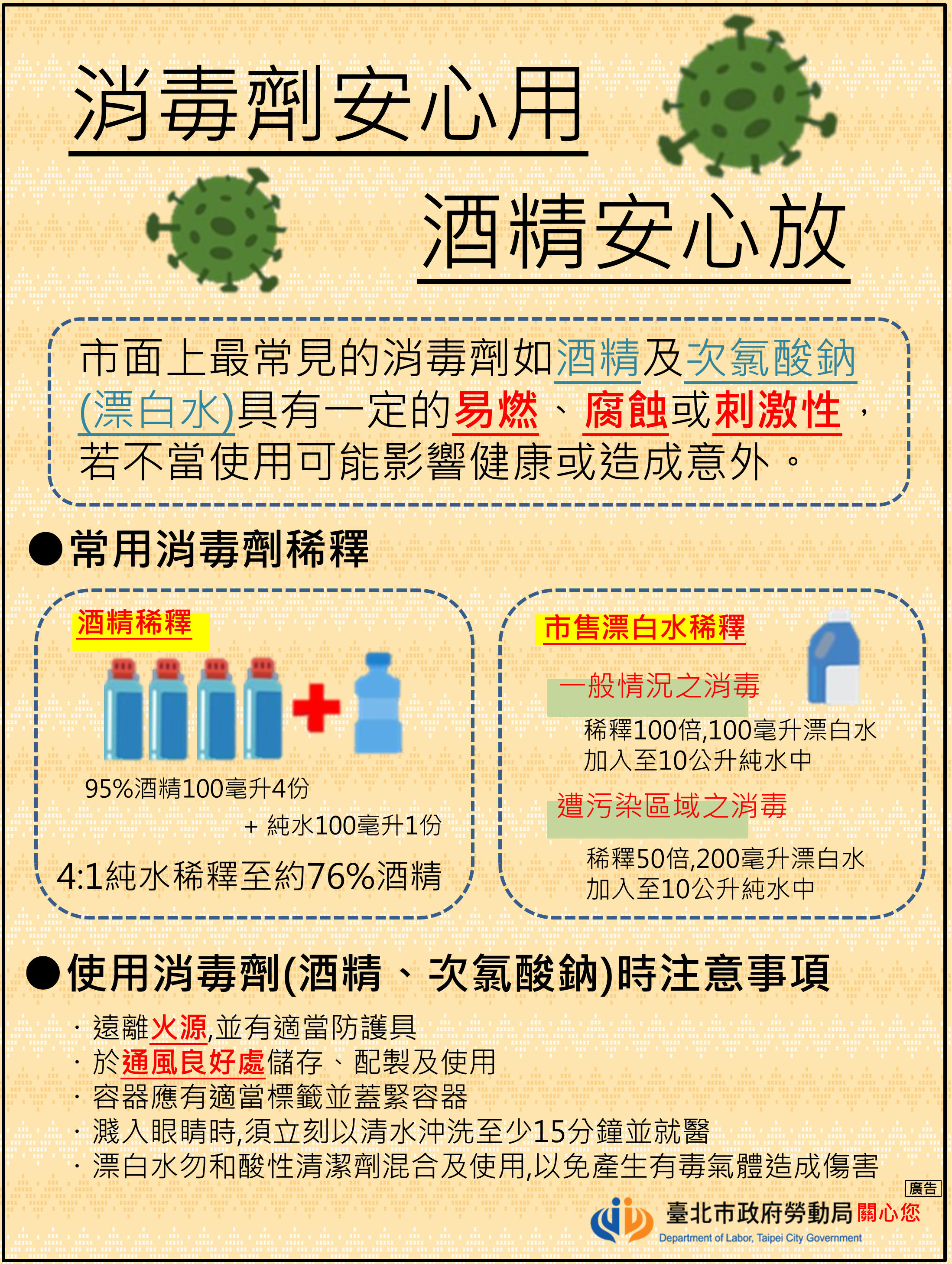 三、有鑑於錢櫃KTV大火造成嚴重傷亡事故,目前適值防疫期間,各單位均備置一定數量之酒精等消毒劑,該消毒劑具有一定的危險性,若使用或存放不當可能造成意外,勞動局整理「正確使用消毒劑」宣導單張與乙醇安全摘要如附件,惠請廣為宣導、轉知並加強人員教育訓練及緊急事故處理能力, 以免類似意外再發生。