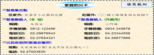 (二)緊急聯絡人:當家人集合有困難(甚至遭遇災害時),家人知道可以向誰(親密的親戚好友)聯絡求助,但應事先安排好。