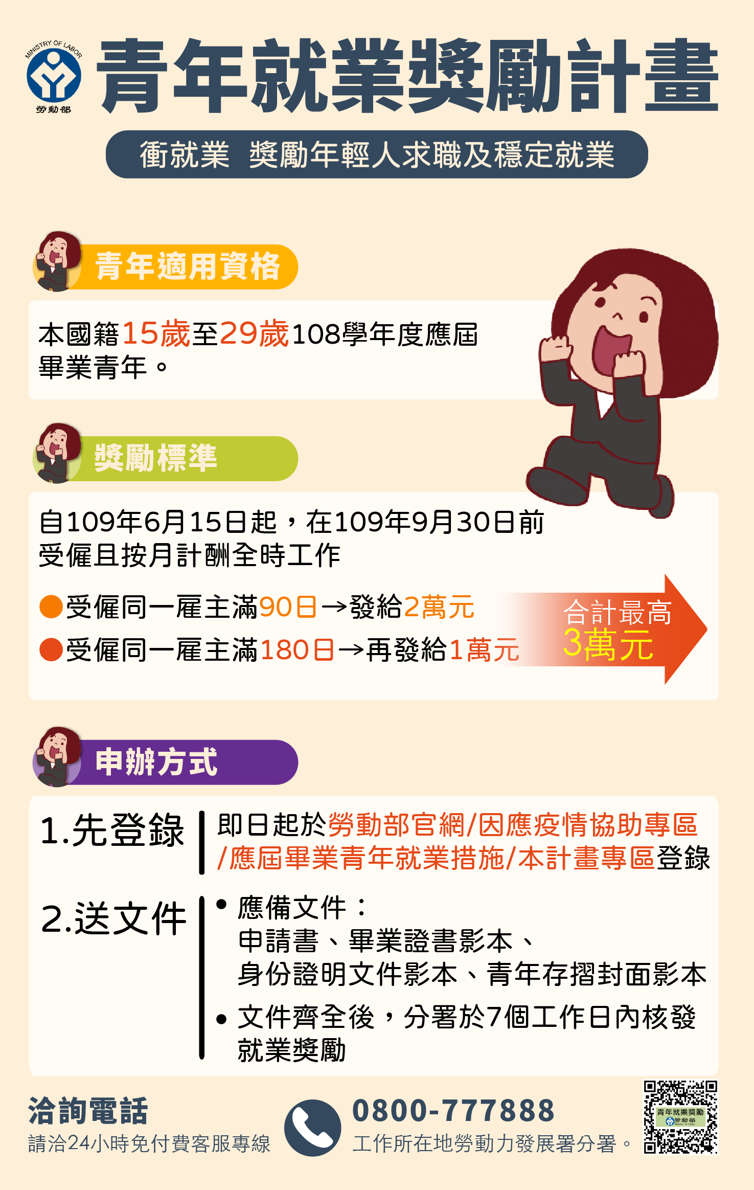 一、勞動部為鼓勵應屆畢業青年於後疫情時期、就業市場逐漸回溫之際,儘速就業,規劃各項應屆畢業青年就業措施,109年6月15日發布實行「青年就業獎勵計畫」,針對本國籍15歲至29歲108學年度應屆畢業青年,舉凡於109年9月底前受僱從事按月計酬全時工作,且穩定就業滿90日者,發給就業獎勵新臺幣(以下同)2萬元;倘持續穩定就業達180日者,則加發就業獎勵1萬元,每人最高獎勵3萬元。