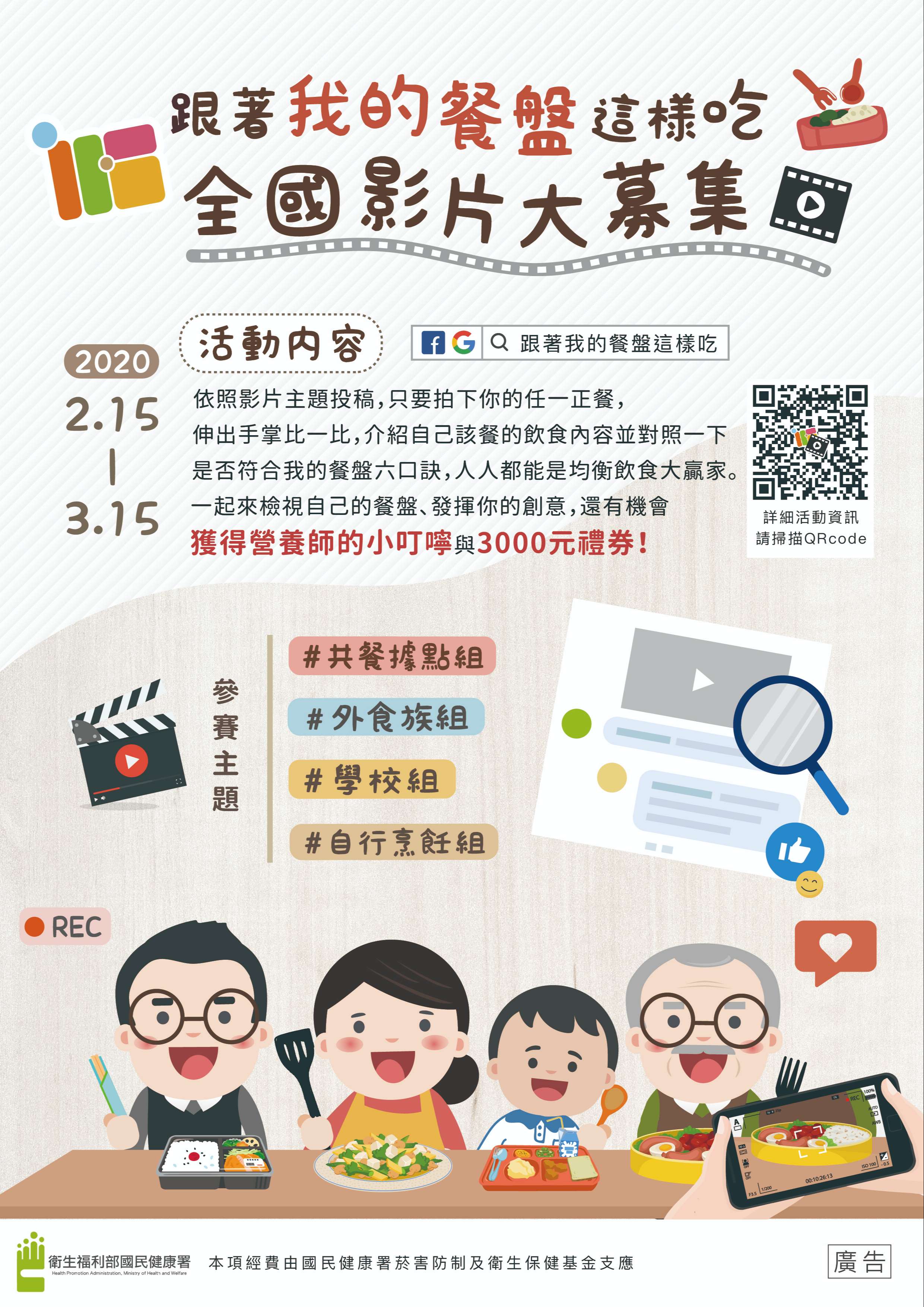 二、為培養民眾建立正確的健康飲食觀念以及落實均衡飲食的 健康生活型態,衛生福利部國民健康署刻正辦理「跟著 『我的餐盤』這樣吃-全國影片大募集」活動,邀請於共餐 據點長者、校園師生、外食及自行烹飪之民眾,透過拍下 任一餐點之影片,並於影片中說明如何符合「我的餐盤」 均衡飲食六口訣,上傳到指定活動頁面並完成指定步驟, 就有機會獲得大獎。活動自即日起至3月15日為止,活動海 報及宣導標語詳如附件1、2,敬請貴校公告,邀請學生、 民眾踴躍參加,詳情請見活動頁面https://eatmyplate. learneating.com/#/。