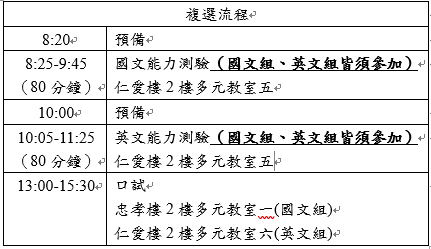 7月25日(四)國文英文能力筆試測驗及口試,若遇颱風影響臺北市停班停課,則順延至7月26日(五)進行。