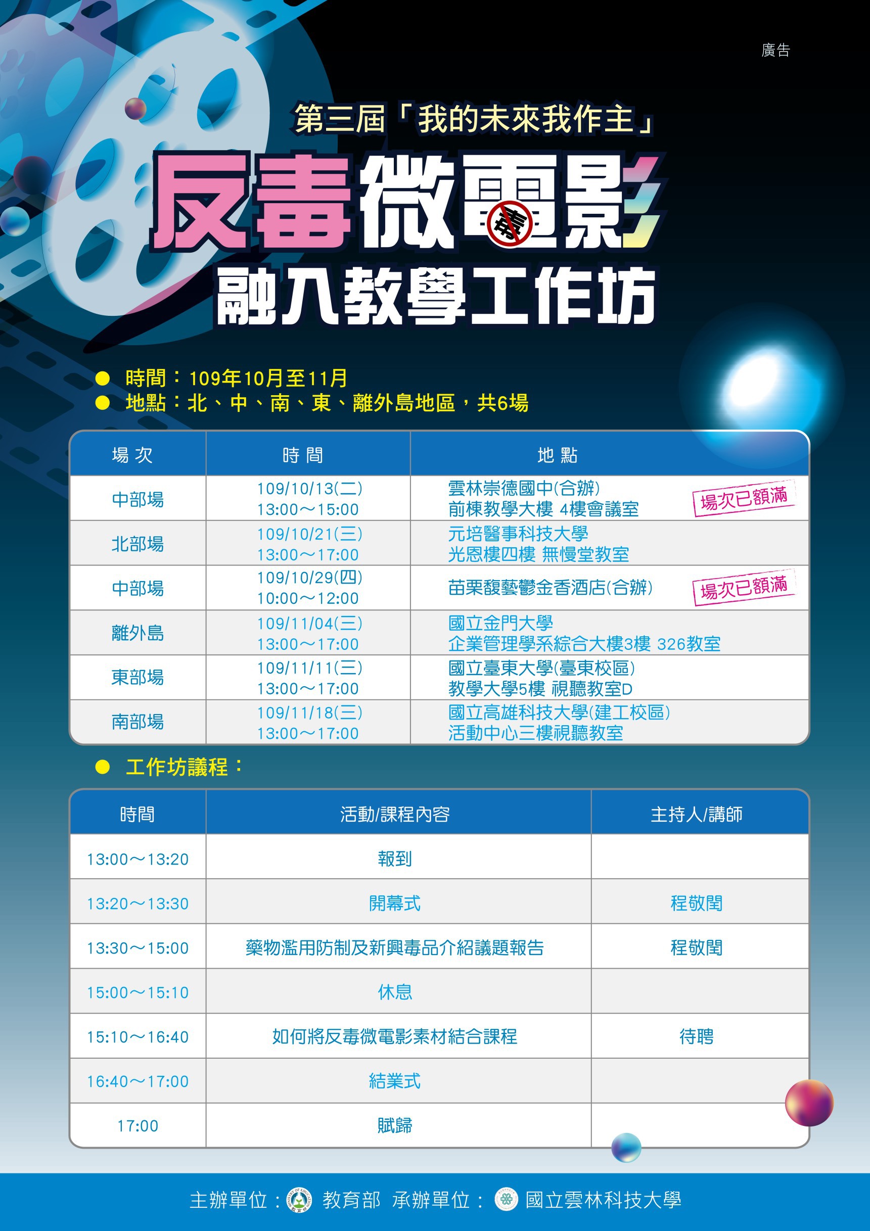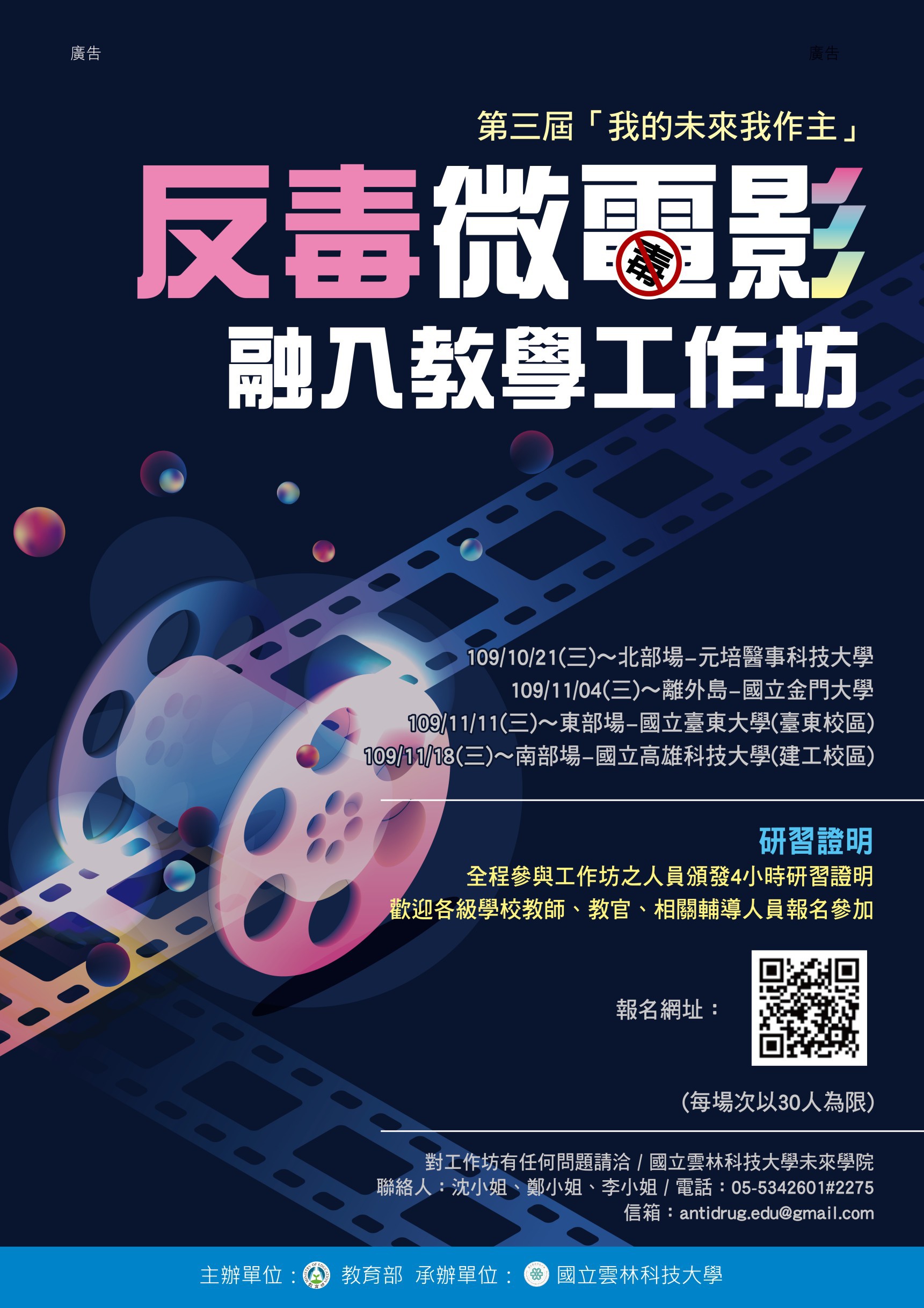 旨揭工作坊係為第三屆「我的未來我作主」反毒微電影競賽後續推廣活動,由雲林科技大學邀請國內藥物濫用防