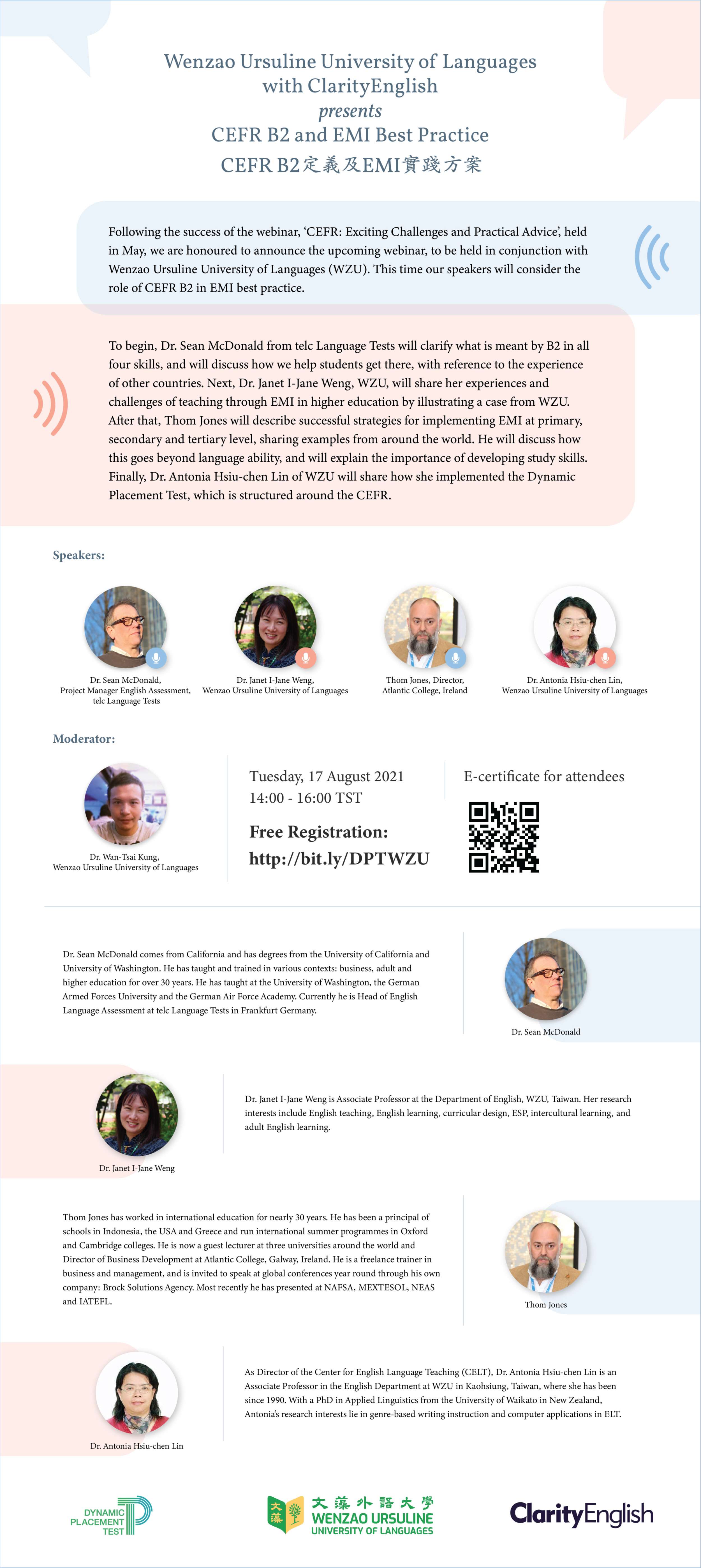 一、配合2030雙語國家政策,本校擬辦理「CEFR B2 and EMIBest Practice(CEFR B2定義及EMI實踐方案)」線上研討會,邀請英國及德國語測專家共同探討本校雙語教學與CEFR-歐洲共同語文參考標準(The Common EuropeanFramework of Reference for Languages,簡稱CEFR),研討CEFR B2對台灣老師及學生的定義,及以世界不同的案例去探討EMI最佳實踐方案。