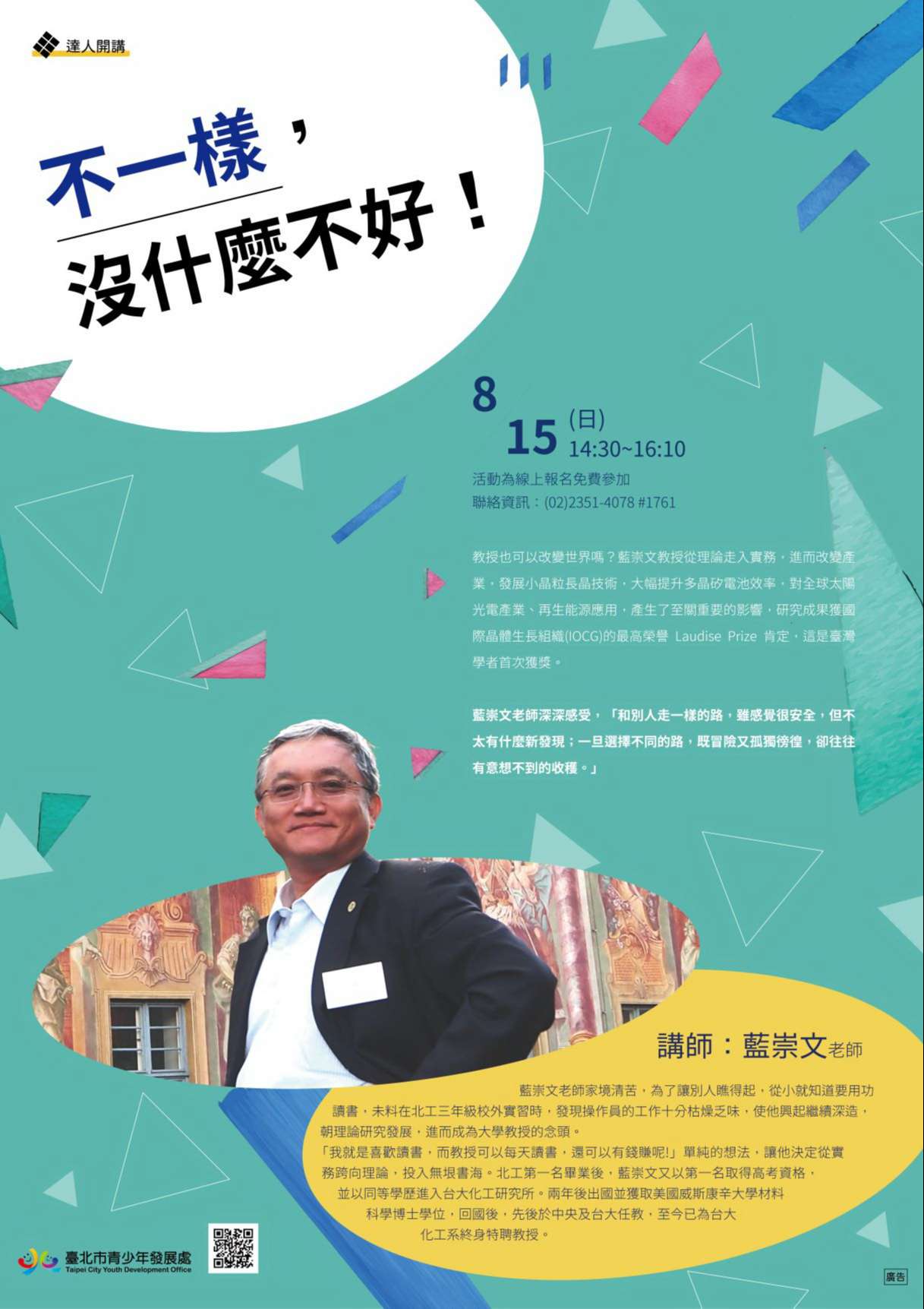 說明:臺北市青少年發展處8月15日14:30舉辦達人開講「不一樣,沒什麼不好!」,