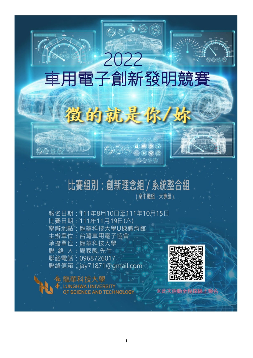 一、2022年台灣車用電子協會主辦之「2022車用電子創新發明 競賽」,擬將於111年11月19日(六)8:00至16:00假龍華 科技大學U棟體育館舉辦,開始報名時間為111年8月10日至 111年10月15日,本競賽不限就讀系所,身分只要為高中職 與大專學生均可組隊參加。