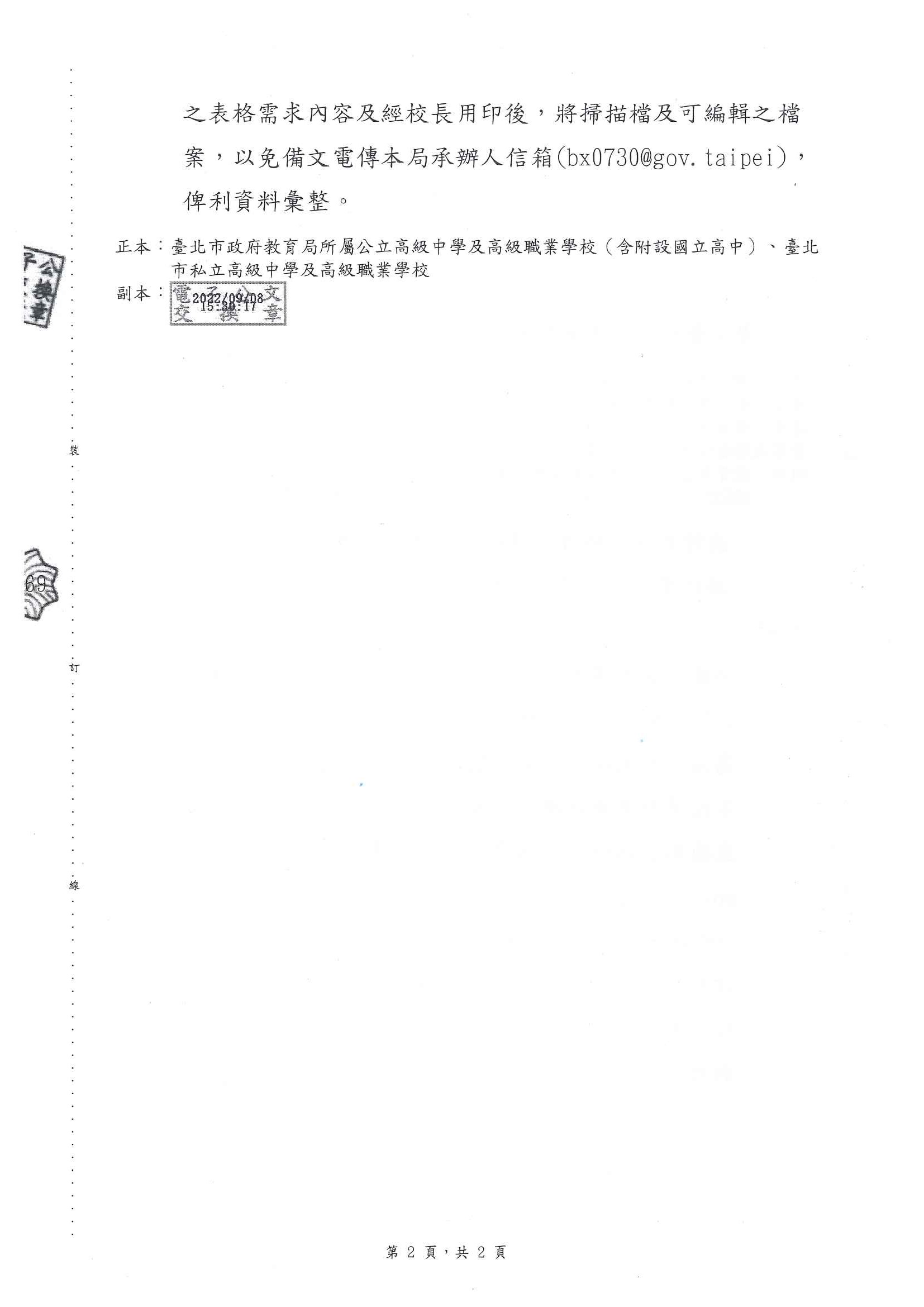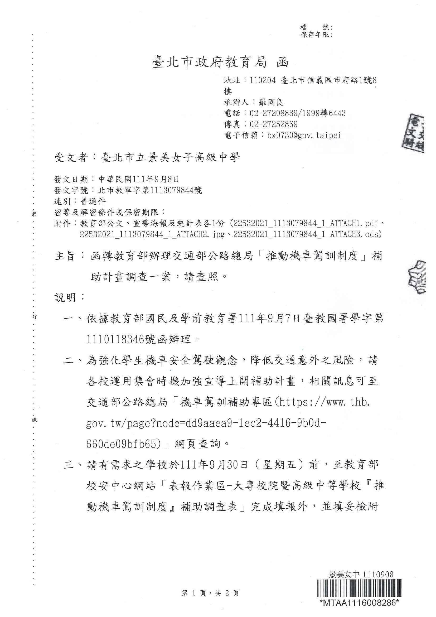 一、依據臺北市政府教育局111年9月8日北市教軍字第1113079844號函辦理。