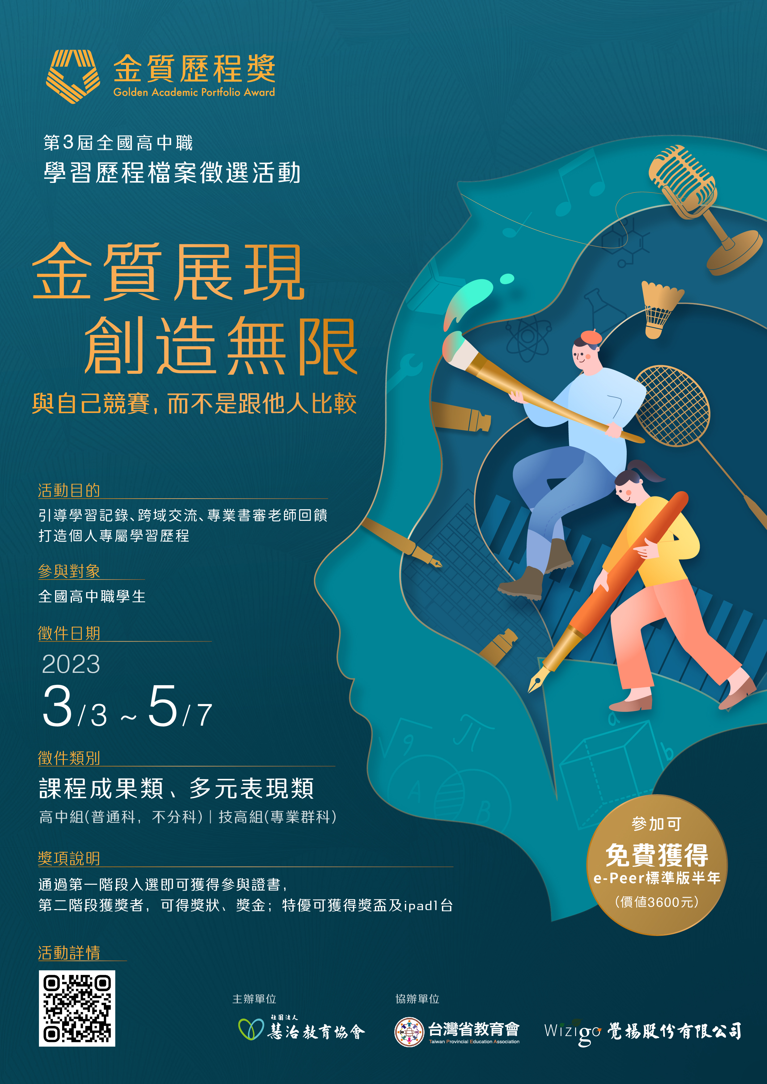 一、慧治教育協會以適性引導的理念推廣透過智慧科技工具 【e-Peer 共學平台】讓學生能記錄學習軌跡,透過回顧統 整學習、反思累積與轉變,肯 定自我、挑戰成為更好的自 己。為了促進跨校交流,並提供學生展現自我的舞台,特 舉辦全國高中職學習歷程檔案徵選活動【金質歷程獎】, 鼓勵學生報名活動並上傳學習歷程檔案,除了可獲得書審 老師給予的實質回饋,更了解學習歷程檔案製作的重點之 外,獲獎學生也有機會受邀公開分享作品成果,培養邏輯 思考及口語表達能力,奠定自主學習的基 礎。歡迎貴校教 師鼓勵學生報名參加,也可透過 e-Peer 共學平台引導統 整學習故事,將學習經驗打造成金質歷程!