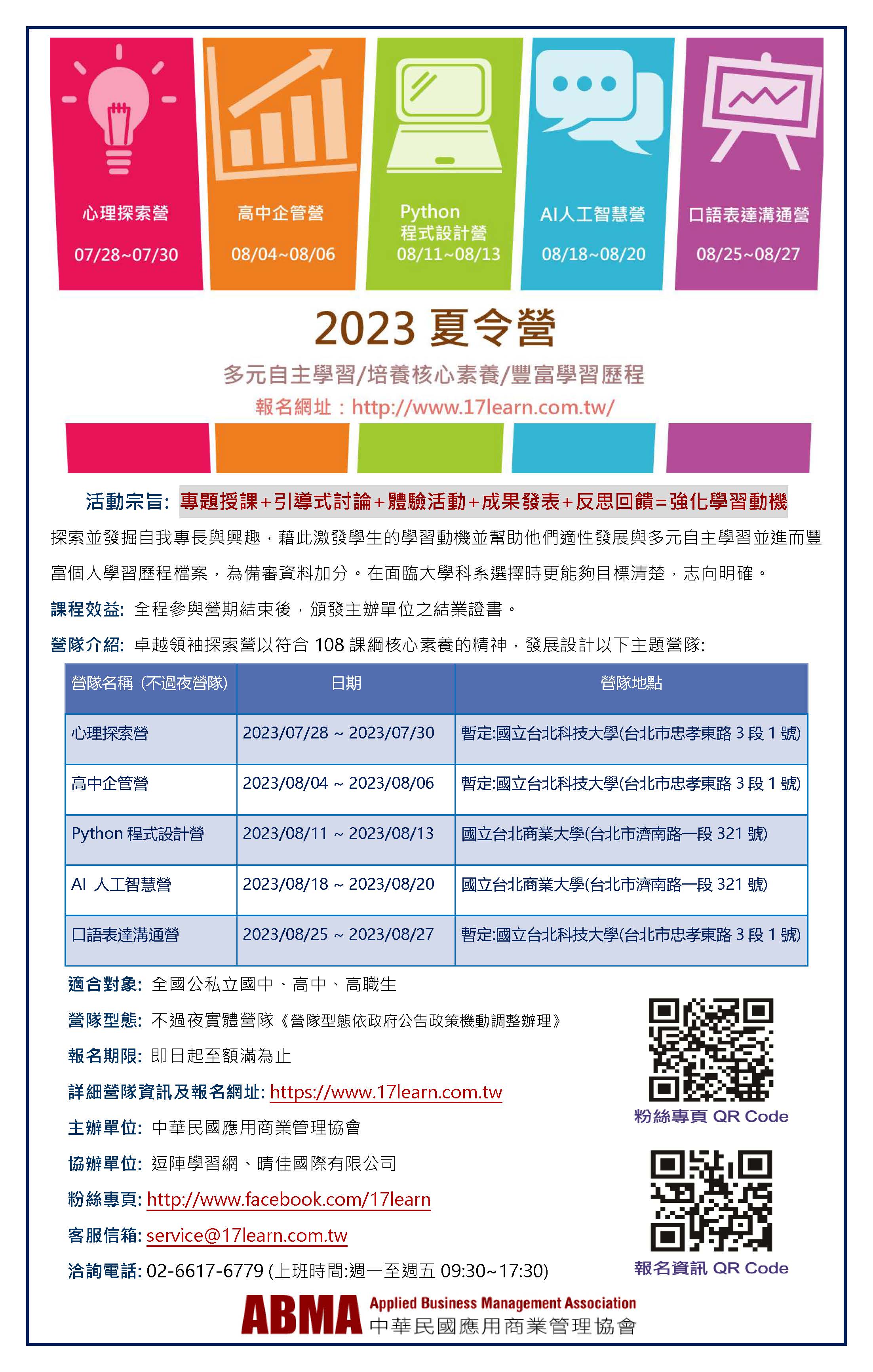 二、營隊名稱:「心理探索營」、「高中企管營」、「AI人工智 慧營」、「口語表達溝通營」、「Python程式設計營」 三、營隊效益:協助發展核心素養,強化學習動機。全程參與課 程結束後,並頒發主辦單位所頒發的24小時研習證明。 四、適合對象:詳情請參考官網各營隊說明 五、報名日期:即日起至額滿為止。