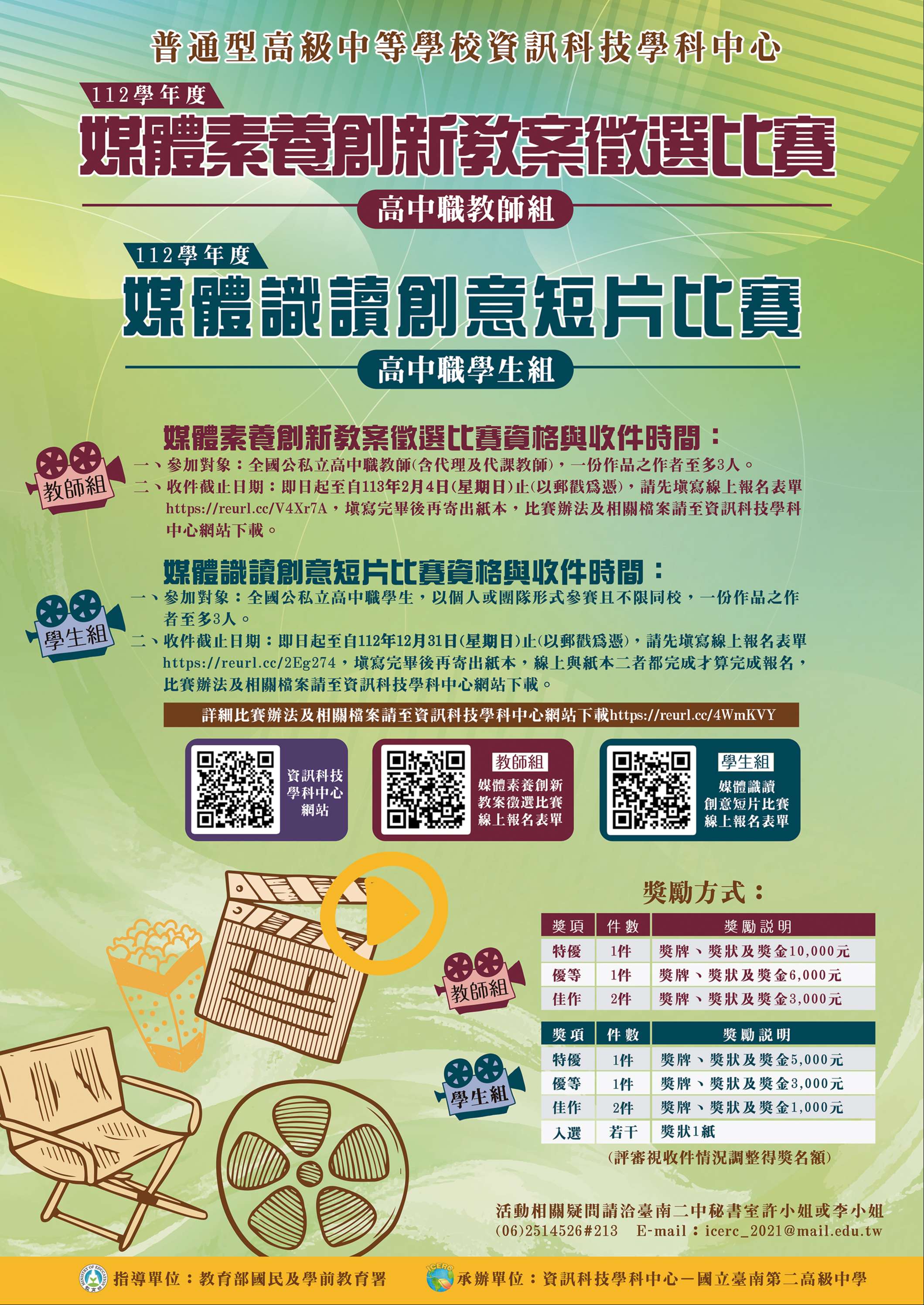 主旨:檢送教育部普通型高級中等學校資訊科技學科中心辦理「112學年度媒體識讀創意短片比賽實施計畫」(如附件),敬請協助公告,並鼓勵貴校學生踴躍報名參加,請查照。說明: