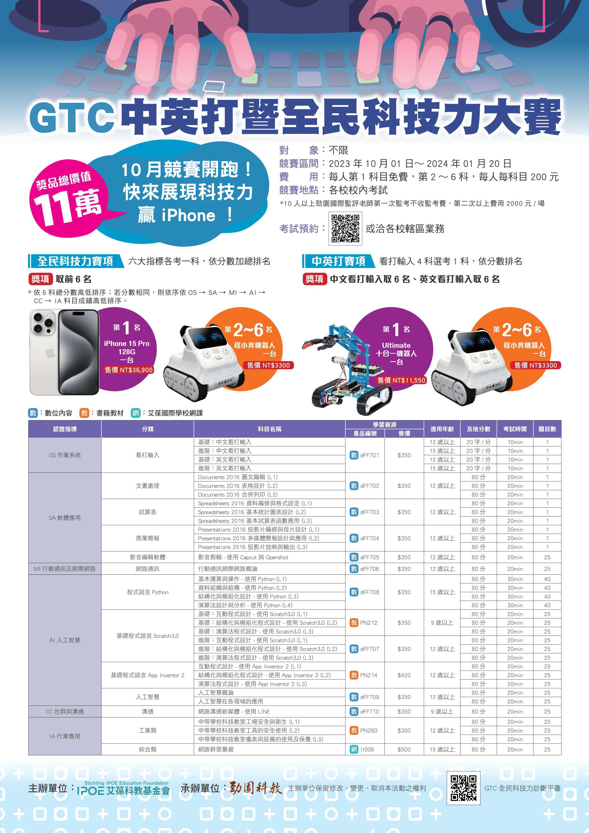 主旨:檢送「GTC中英打暨全民科技力大賽」活動文宣乙份,敬請轉知所屬各級公私立學校,並鼓勵同學踴躍報名參加。