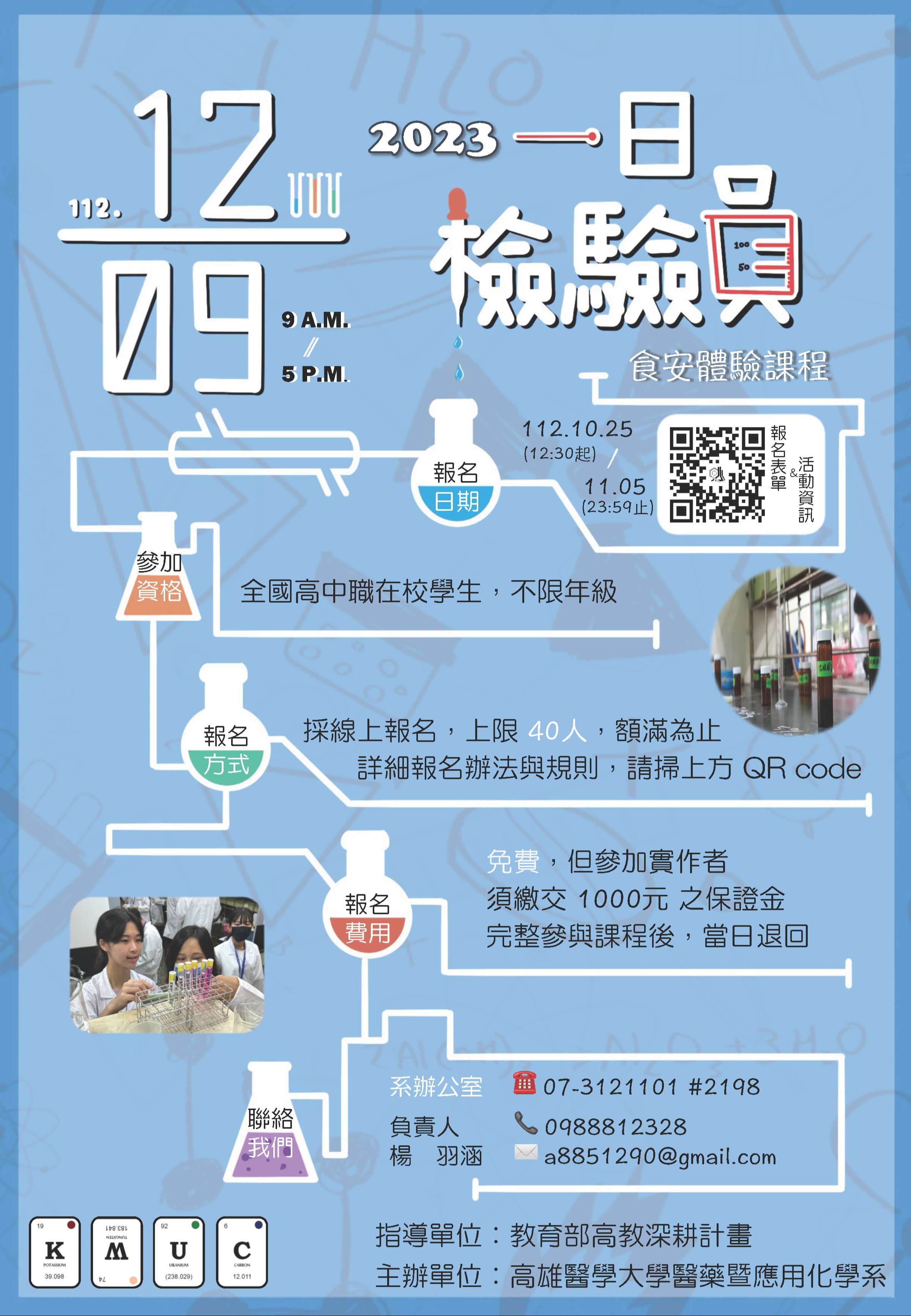 二、報名期間自112年10月25日起至11月5日止,採免費報名, 限額40人。其他相關說明請詳競賽辦法及本系網站,報名 網址:https://chem.kmu.edu.tw/。