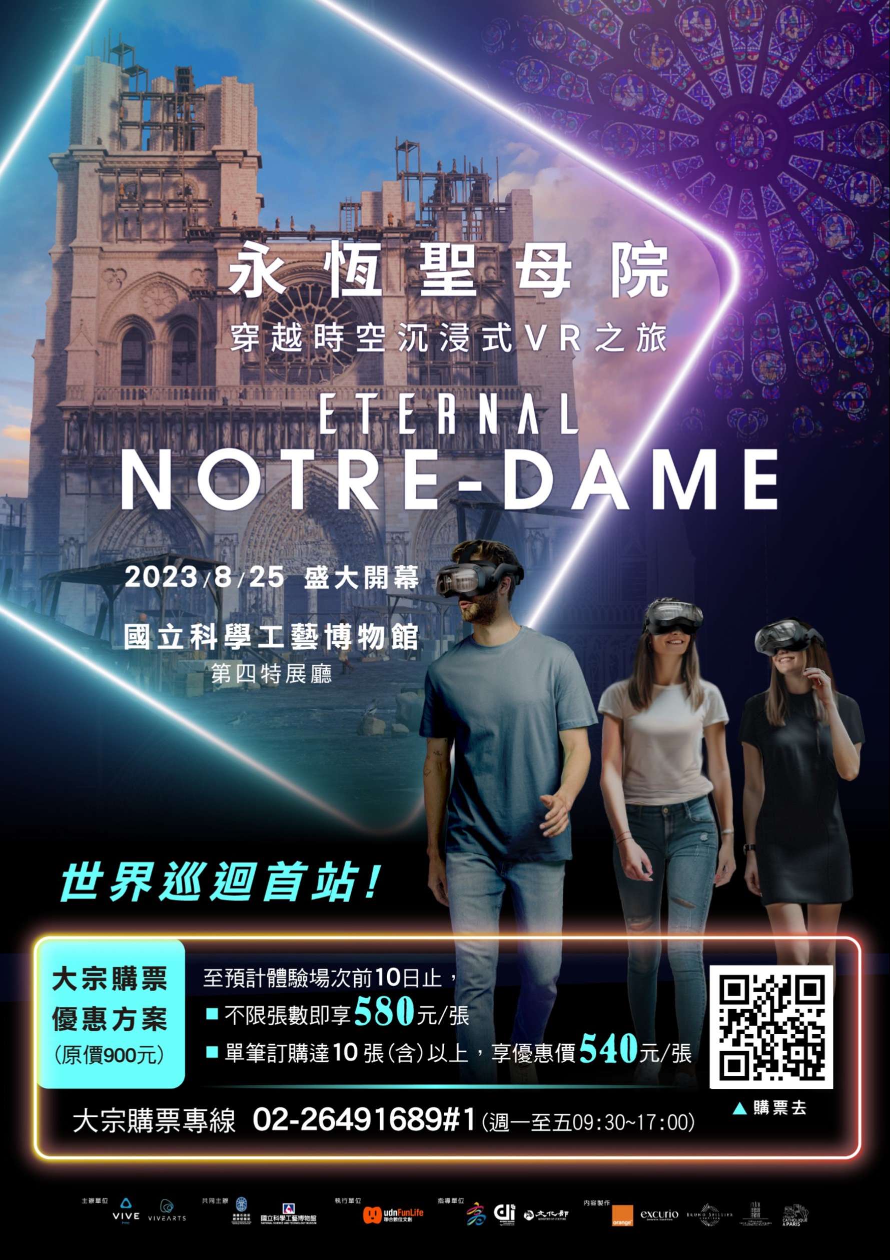 一、法國指標性的哥德式建築,同時也是寶貴的文化藝術資產 「巴黎聖母院」於2019年4月慘遭祝融,重建計畫受到全球 矚目及支持,除了建築本身的修建外,法國電信商Orange 與天主教巴黎總教區、巴黎市政府合作打造以融合VR科技 的沉浸式體驗《永恆聖母院》來重現巴黎聖母院的歷史與 藝術價值,也被視為科技復興世界文化遺產的重要里程 碑。如此別具歷史意義的VR體驗在HTC、VIVE Arts策畫、 本公司執行的共同合作下,引進台灣作為海外巡迴首站。 《永恆聖母院》是一趟穿越時空的沉浸式數位旅行,觀眾 來到《永恆聖母院》的展覽現場,建立一個虛擬分身之 後,僅須配戴VR頭顯裝置及背包,就可以在虛擬導遊的引 領下,飛越國界直達法國,重回十二世紀巴黎聖母院開始 建造的最初時刻。深入建築內部,以360度全方位近距離觀 賞末日審判之門、祭壇、拱頂、玫瑰花窗、管風琴等精湛 絕美的建築元素;最後跟著升降梯登上69公尺高的鐘塔, 在巨鐘的底下感受多具銅鐘齊響的震撼。還能走出塔樓到 戶外,以絕佳的視野俯瞰瞭望大文豪雨果筆下的巴黎世 界,並重回2019年燒毀前屋頂尖塔的火災現場,向世人展 示正如火如荼進行中的修復計畫。全長共45分鐘的VR走動 式體驗,《永恆聖母院》將提供學生們一個既有趣又教育 性的嶄新體驗,有助於拓寬國際藝文視野及對於元宇宙、 虛擬實境科技的認識。