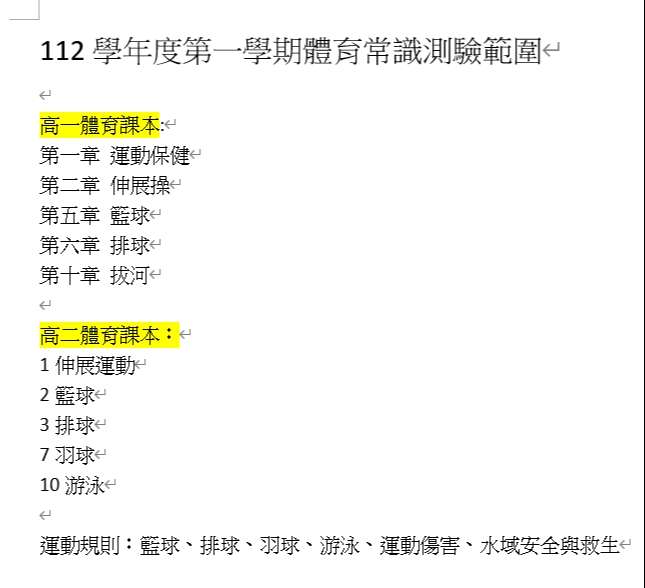 運動規則:籃球、排球、羽球、游泳、運動傷害、水域安全與救生