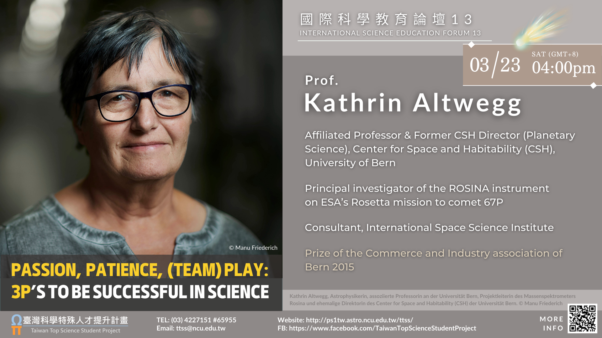 一、Prof. Kathrin Altwegg在巴塞爾大學取得實驗物理學博士 學位,1982年加入瑞士伯恩大學的空間探測和行星學系。 1996年,她成為羅塞塔項目有關彗星67P/Churyumov Gerasimenko的ROSINA項目經理。至今,她在伯恩大學空間 研究和行星學系擔任全職教授和研究員。2015年,因在羅 塞塔項目上的卓越成就,獲得了伯爾尼商業和工業協會頒 發獎項。