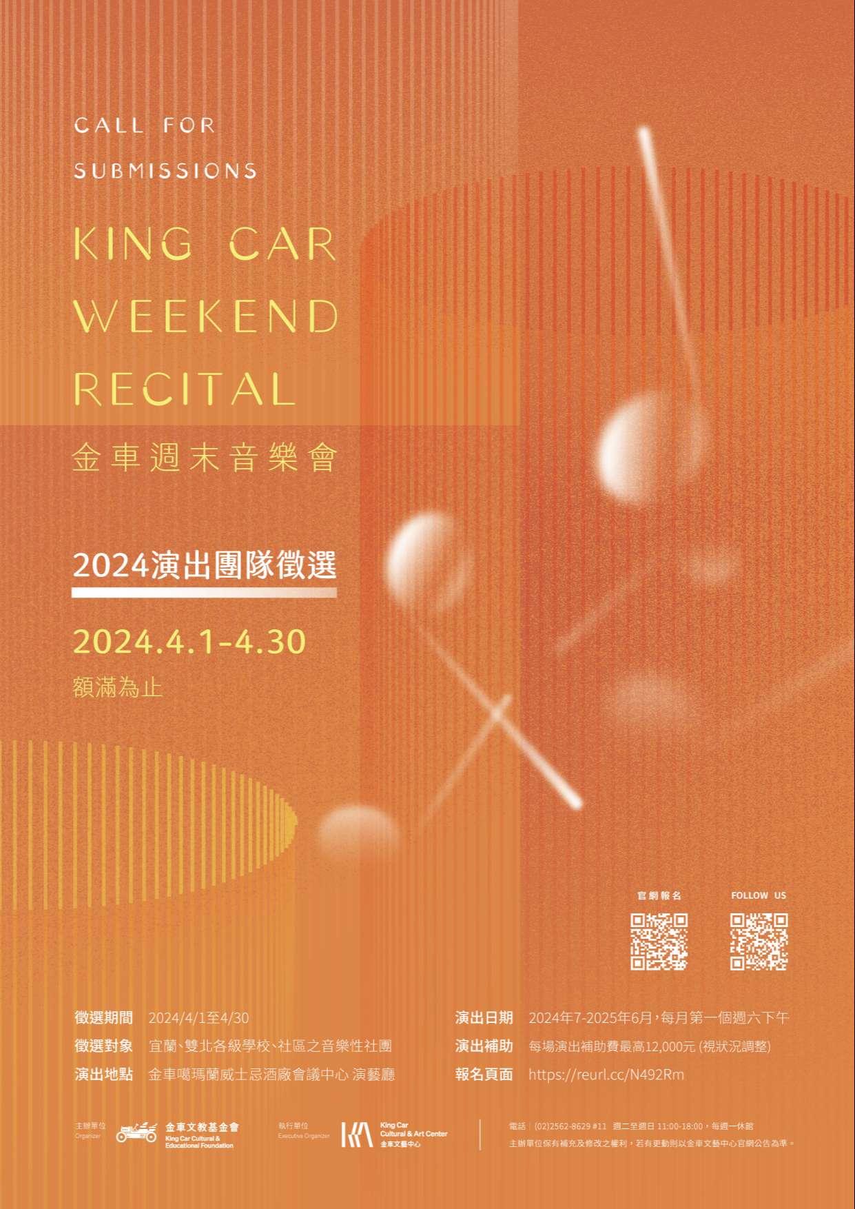 二、「2024金車週末音樂會」徵選活動內容 (一)申請對象:雙北、宜蘭、花蓮、台東地區各級學校以及 社區之音樂性質社團。 (二)申請日期:2024年4月1日至2024年4月30日止。 (三)演出時間:2024年7月起至2025年6月止,每月第一個週 六下午。 (四)演出地點:金車噶瑪蘭威士忌酒廠 會議中心演藝廳 (五)演出地址:宜蘭縣員山鄉員山路二段 326 號(六)參加費用:經審查通過後免費使用,並補助新台幣 12,000元 (七)申請方式:線上申請,詳情請上金車文藝中心官網/競賽 與徵件頁面查詢 (https://www.kingcarart.org.tw /projects/award)