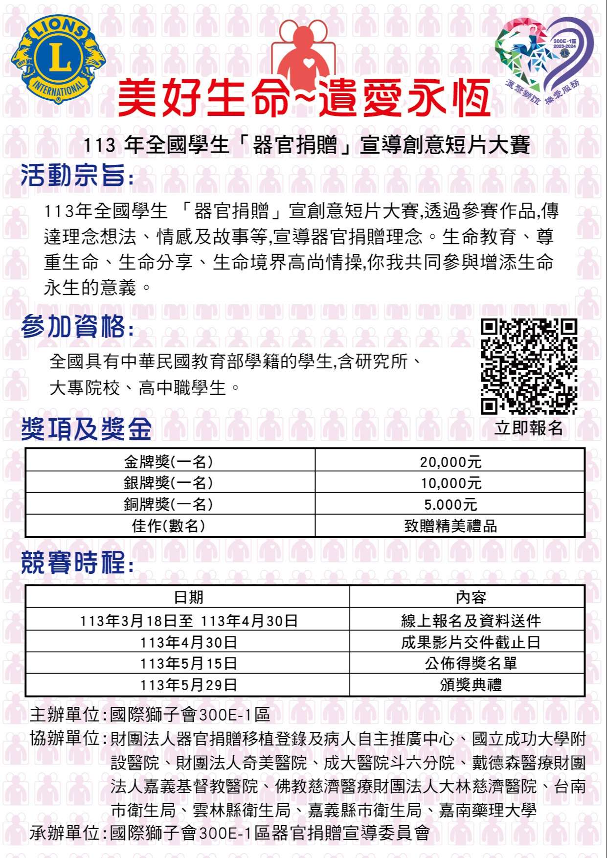 一、旨揭「獅子會」,為世界最大公益社團之一,本次舉辦旨 揭活動,透過參賽作品,傳達理念、想法、情感及故事 等,宣導器官捐贈理念,鼓勵行善至終之生命教育意義。