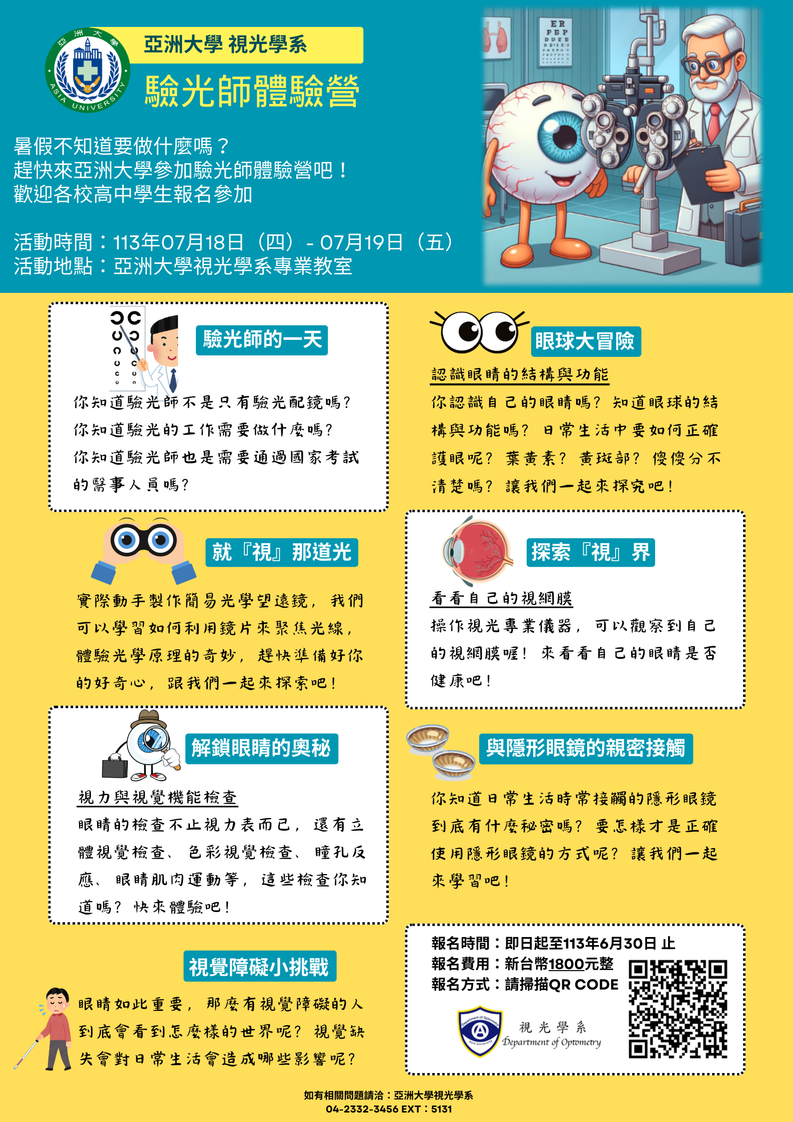 一、本校訂於113年7月18日(四)至7月19日(五)辦理驗光師體驗 營,報名時間自即日起至6月30日(日)止,採線上報名方 式,惠請協助公告。