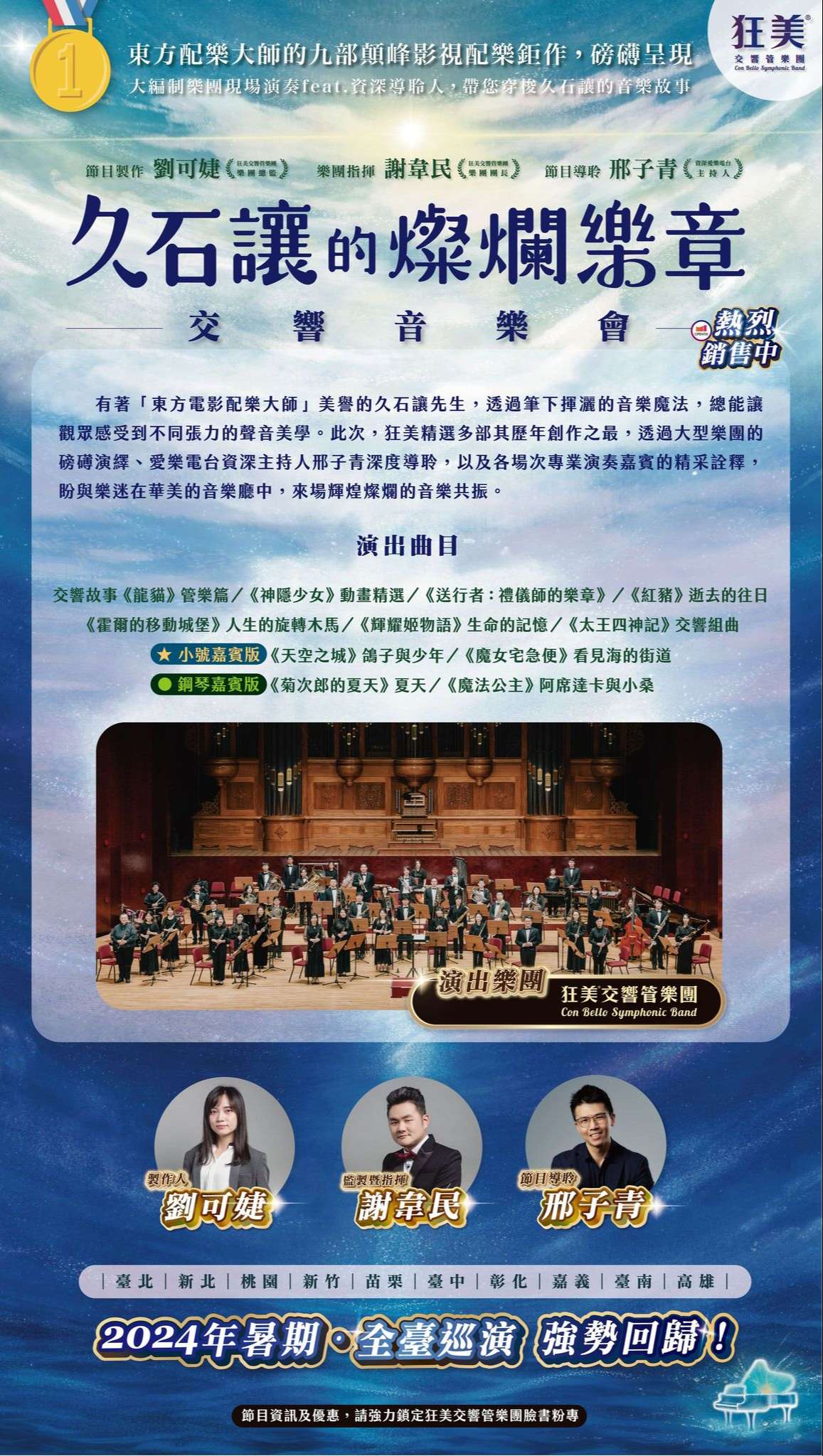 一、節目介紹:久石讓先生,身兼作曲家、指揮家、鋼琴家, 及「吉卜力工作室」音樂總監的多重身分,透過筆下揮灑 的音樂魔法,他總能在每部影像作品中,讓觀眾感受到不 同張力的聲音美學,本節目中狂美精選多部久石讓先生歷 年創作之最,盼與樂迷朋友在華美的音樂廳中,來場輝煌 燦爛的音樂共振。