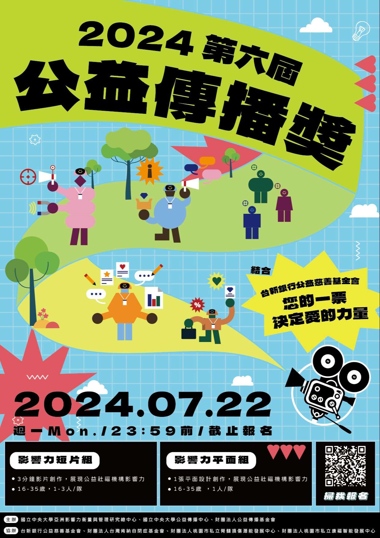五、為推動傳播媒體之公益應用,倡導「見益有為」運動,國 立中央大學亞洲影響力衡量與管理研究總中心、國立中央 大學公益傳播中心及財團法人公益傳播基金會共同主辦第 六屆公益傳播獎。本競賽目的在鼓勵青年透過影像創作及 平面設計形式,呈現台灣的公益影響力,為好事發聲,讓 好事發生,展現媒體的正向傳播力,邀請您一同見證。