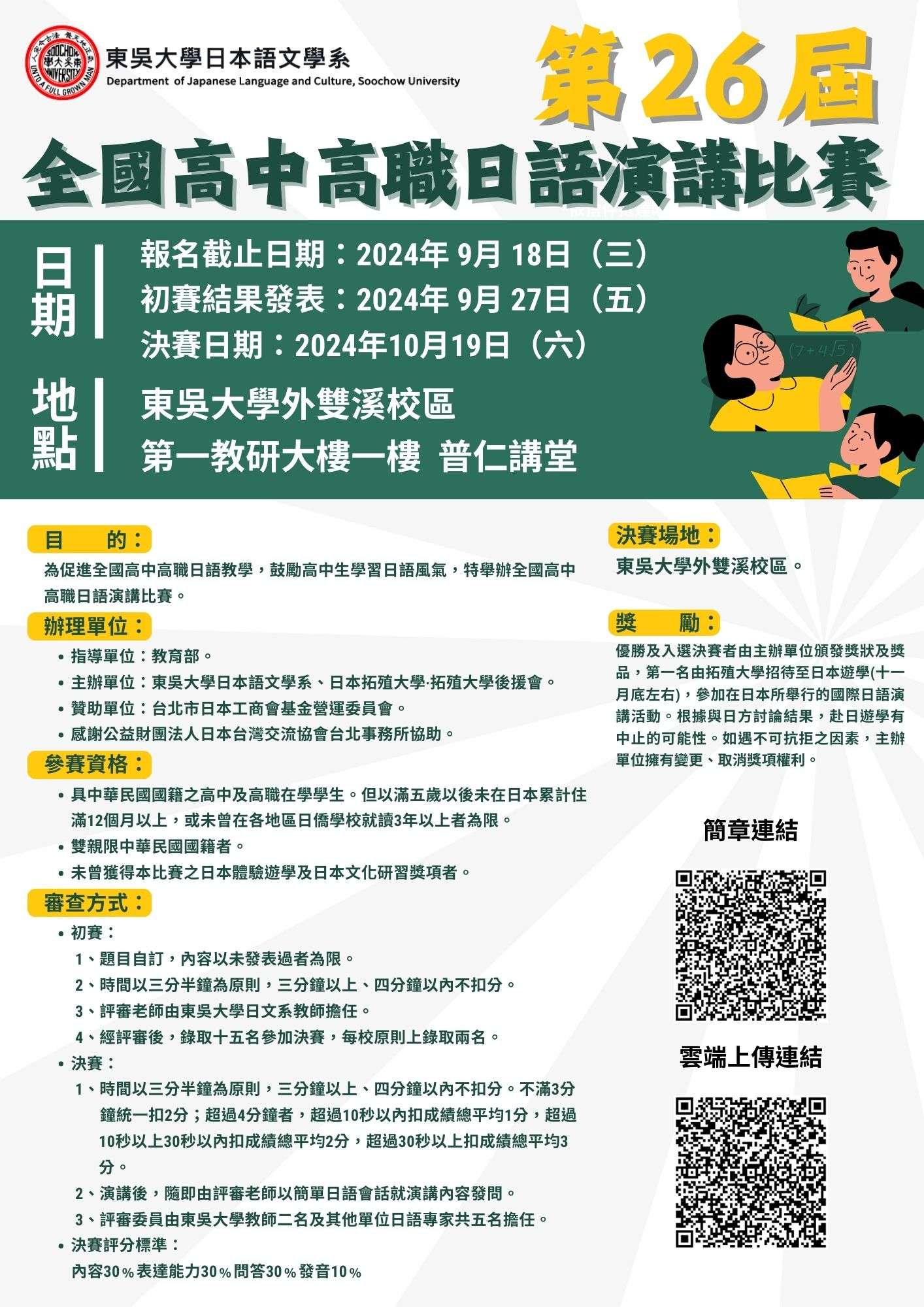 三、相關詳細比賽訊息公告於本校日本語文學系網頁 (https://web-ch.scu.edu.tw/index.php/japanese/file /10494)。