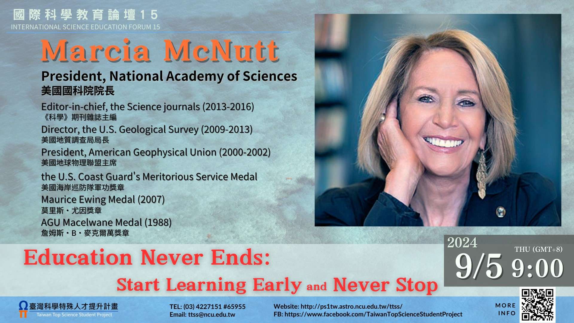 一、本次講座由美國科學院院長Dr. Marcia McNutt主講。Dr. Marcia McNutt是一位地球物理學家,她的研究領域是地質 年代表上地函和岩石圈的動態變化。曾任《科學》期刊雜 誌主編、美國地質調查局局長及美國地球物理聯盟主席, 並因其貢獻而被授予美國海岸巡防隊軍功獎章。這場論壇 同時邀請身為高等教育評鑑中心基金會董事長的李德財院 士擔任主持人,來和美國科學院院長一起探討科學教育。