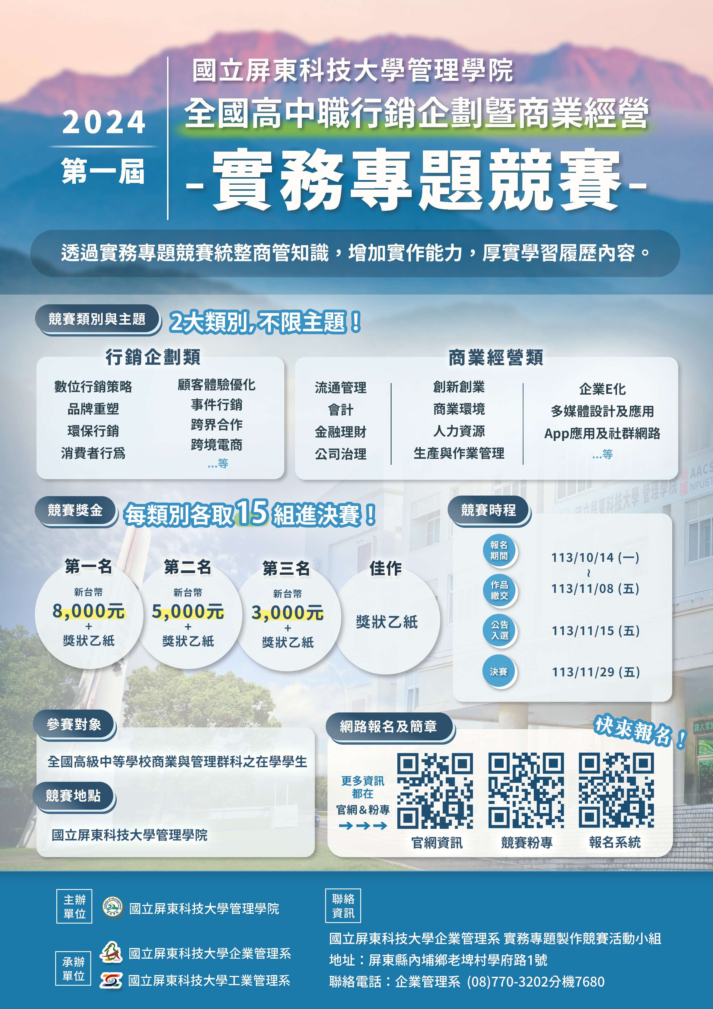 三、檢附簡章及海報各1份。 四、本案聯絡資訊如下: (一)聯絡單位:企業管理系。 (二)聯絡電話:(08)7703202分機7680。