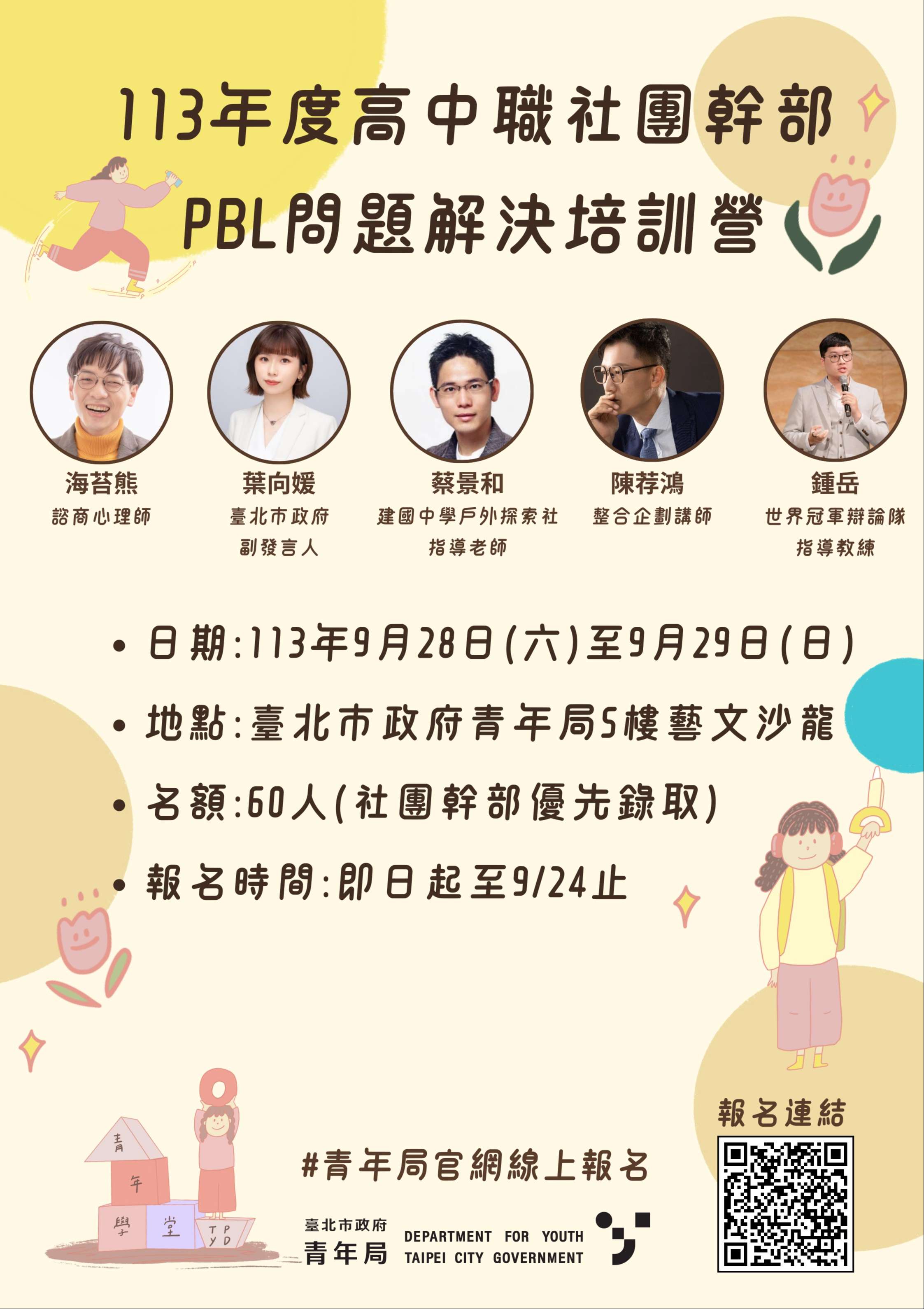 一、營隊宗旨:為鼓勵本市高中職在學青年積極參與學生社團 活動,培養「團隊合作」、「社群行銷」、「活動執 行」、「情境表達」等能力,提供密集課程訓練,利用 「問題導向學習」(Problem-based Learning)授課方式充 實學生社團經營知能,並提供青年局服務資源連結。