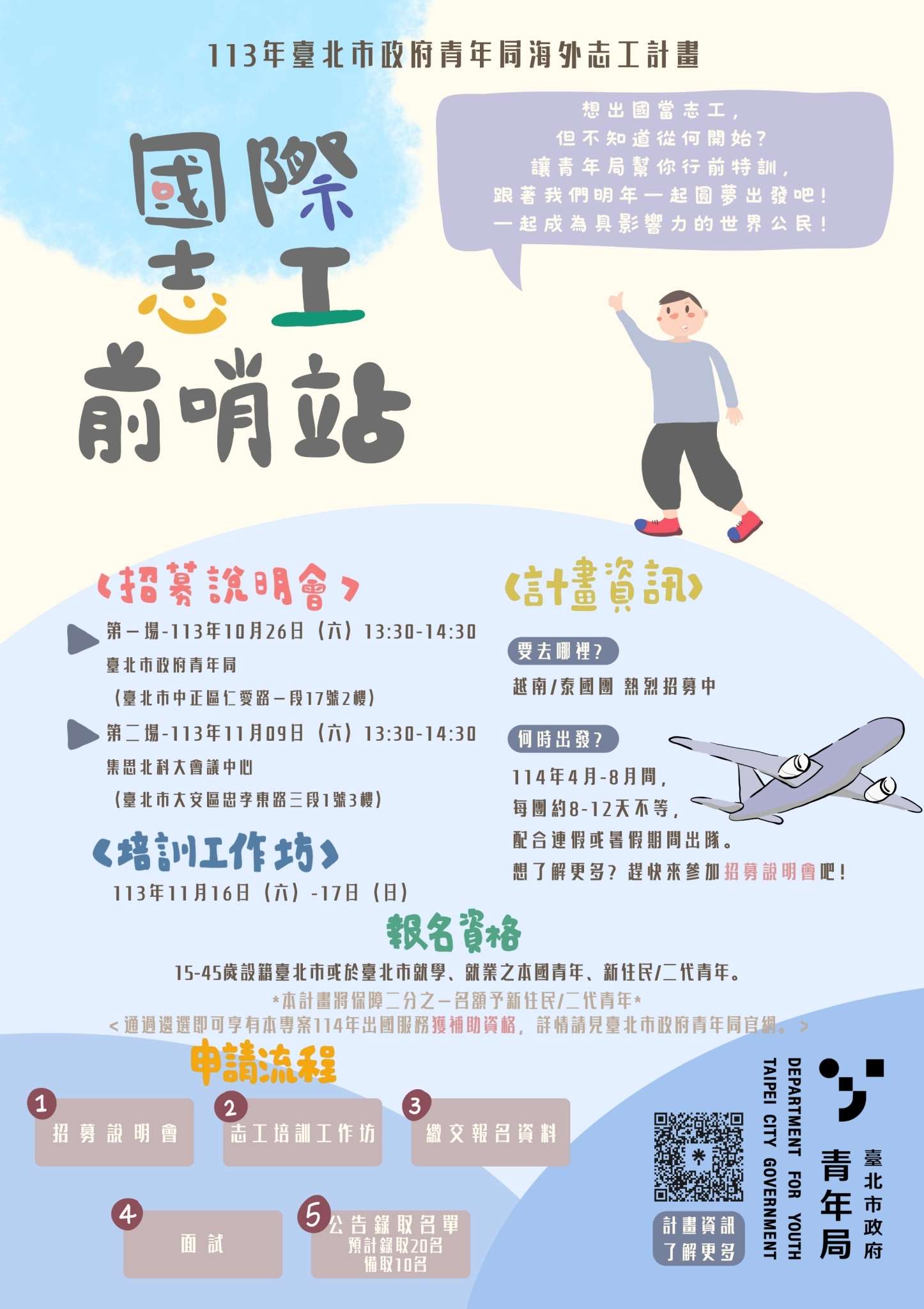 一、本局致力於提升臺北青年的國際視野與參與度,並鼓勵青 年實踐世界公民責任,規劃辦理113年度海外志工計畫,期 待賦能青年成為具影響力之世界公民。