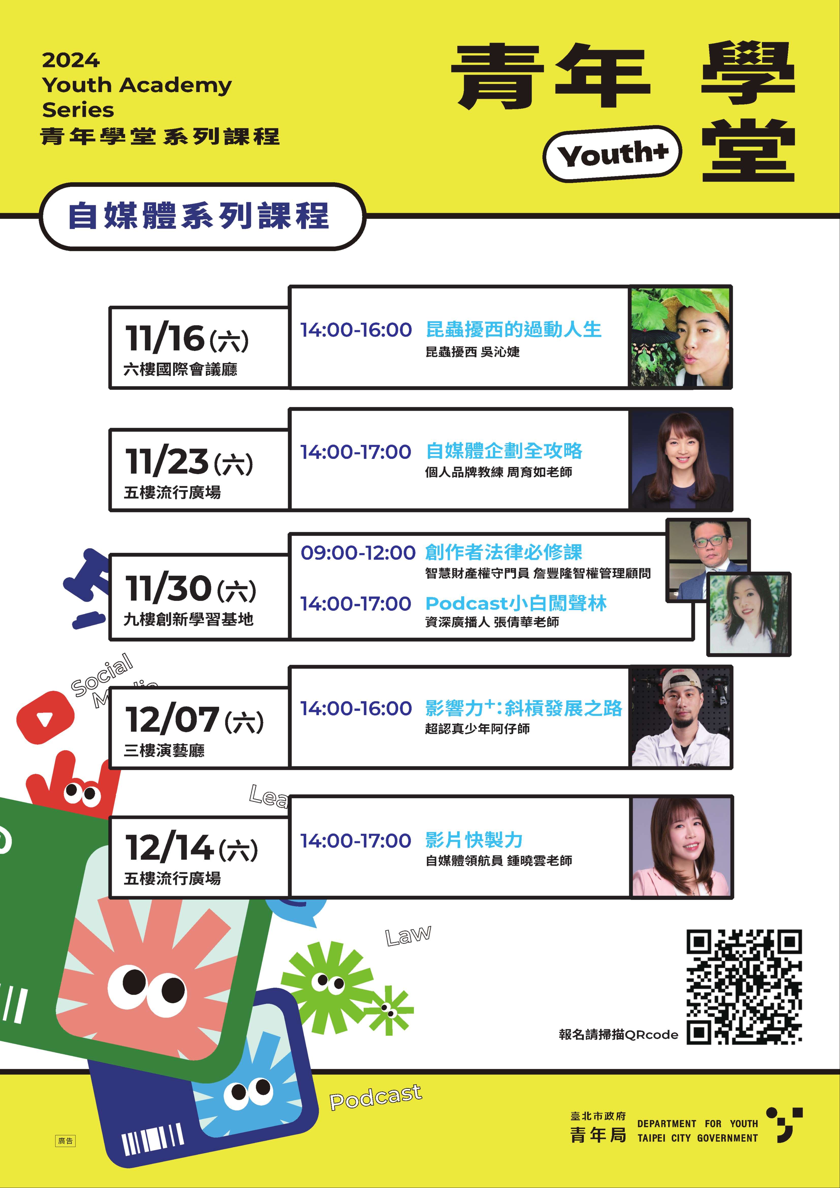 三、檢附「青年學堂-自媒體系列課程」海報電子檔1份,活動 內容可詳見報名網頁。若仍有相關問題,亦可洽詢本局郭 小姐,電話:02-2351-4078分機1112。