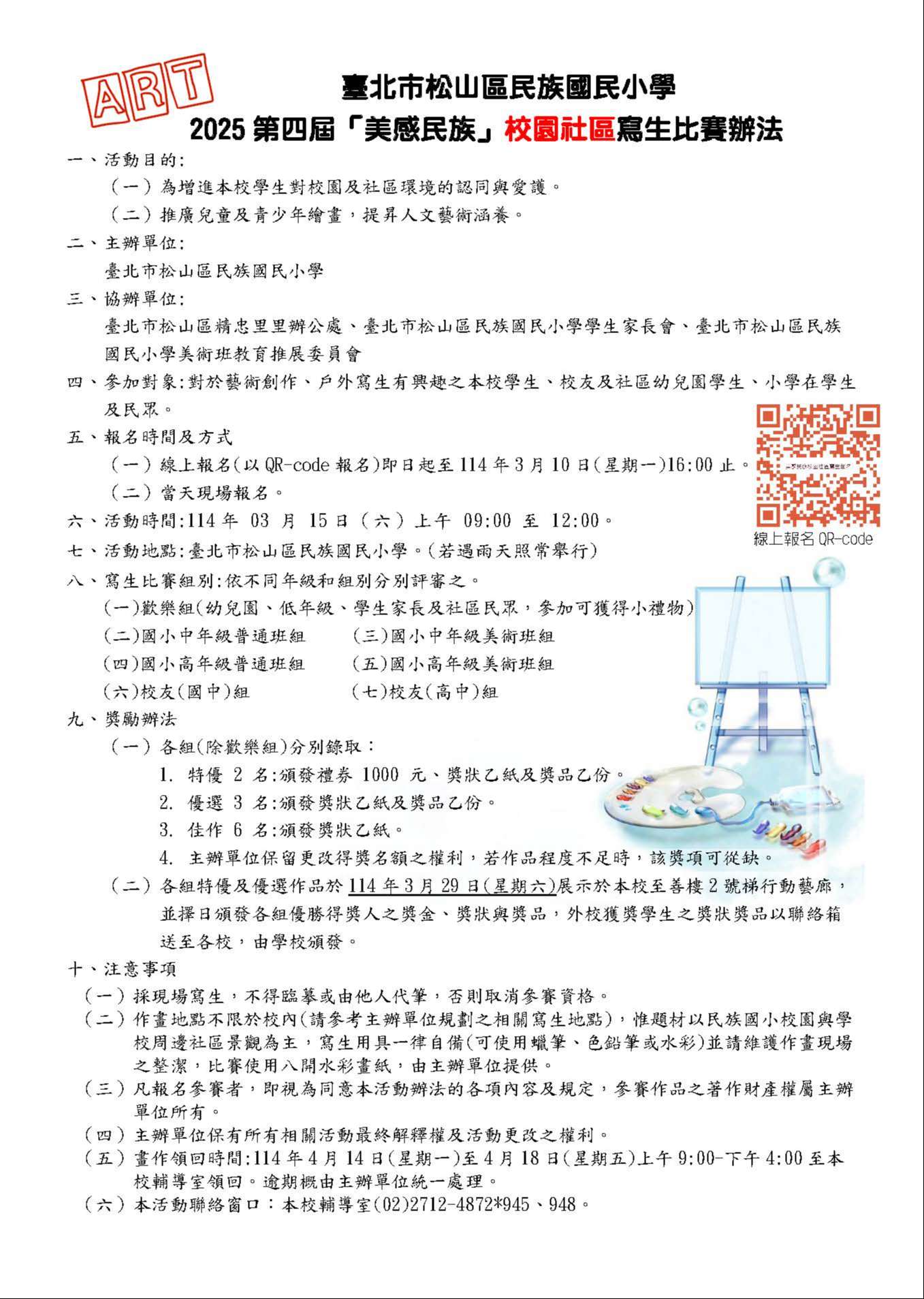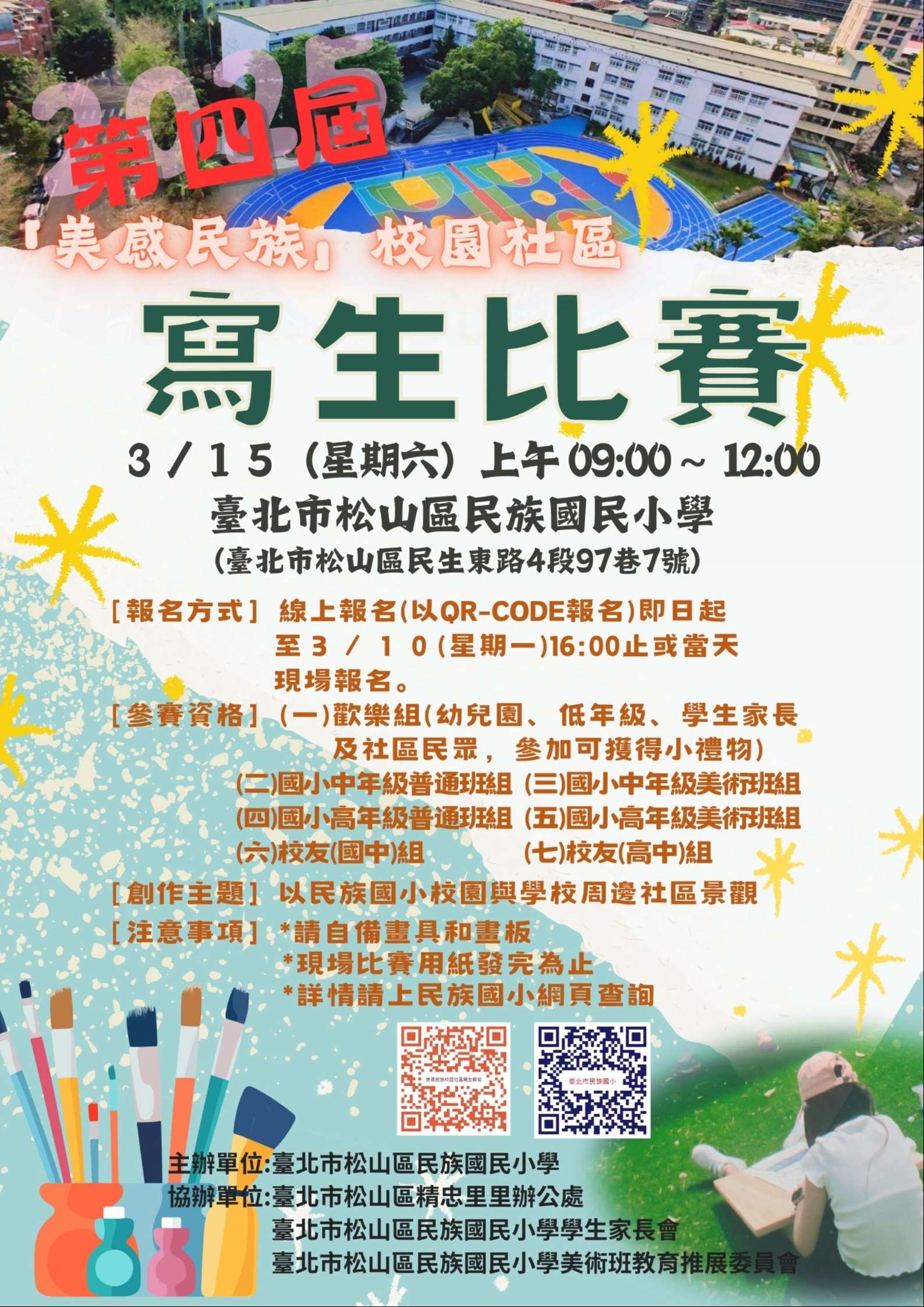 一、比賽時間:114年3月15日(星期六)早上9時至12時整。比賽 地點:臺北市民族國小(臺北市松山區民生東路四段97巷7 號),若遇雨天照常舉行。