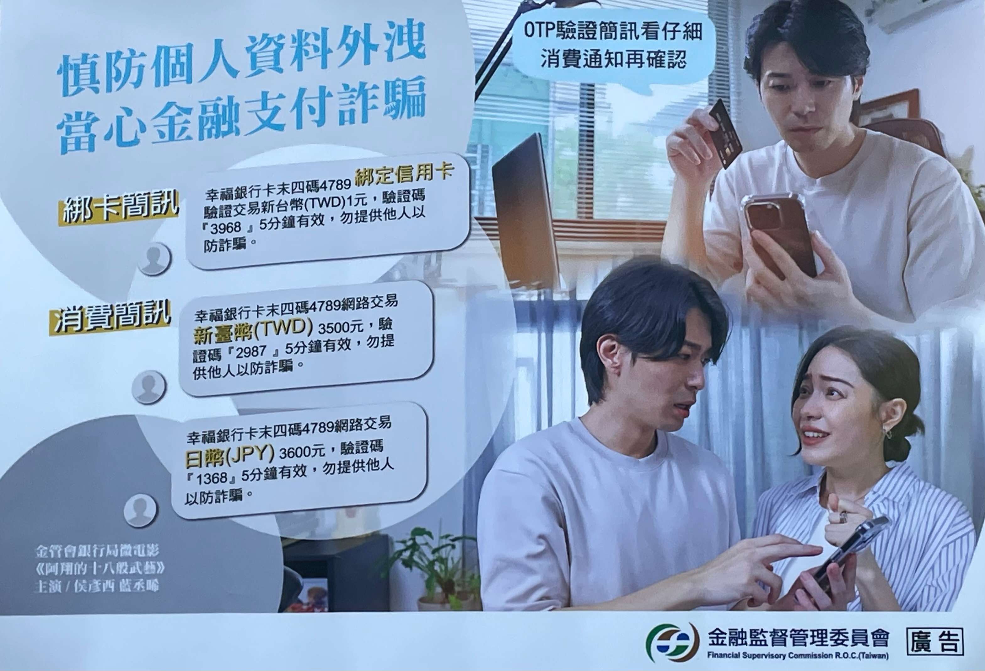 三、另為強化落實民眾金融消費保護教育,金管會銀行局已於 113 年度完成製作「金融支付工具之防詐宣導篇」、「金 融知識宣導微電影」,並已置於金管會官網平臺 (https://www.fsc.gov.tw);請點選首頁「機關介紹/ 影音平臺/金管會YouTube影音頻道」,歡迎點閱收看及分 享。隨文檢附前開微電影宣導海報1份供參。