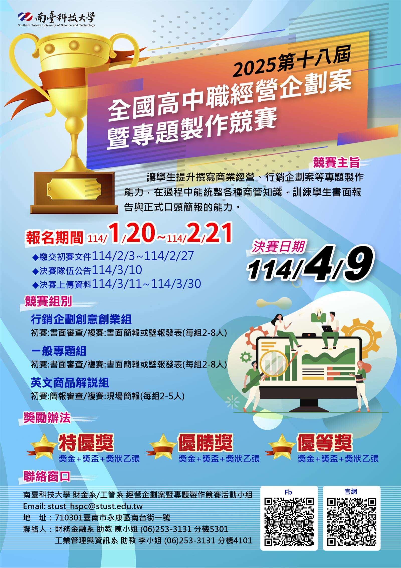 一、本競賽活動為教育部「高教深耕計畫」之分項計畫活動, 歡迎全國高中職學生組隊報名參加。 二、競賽辦法及報名表請至本校商管學院下載,網址: https://business.stust.edu.tw/tc/node/Proposal。