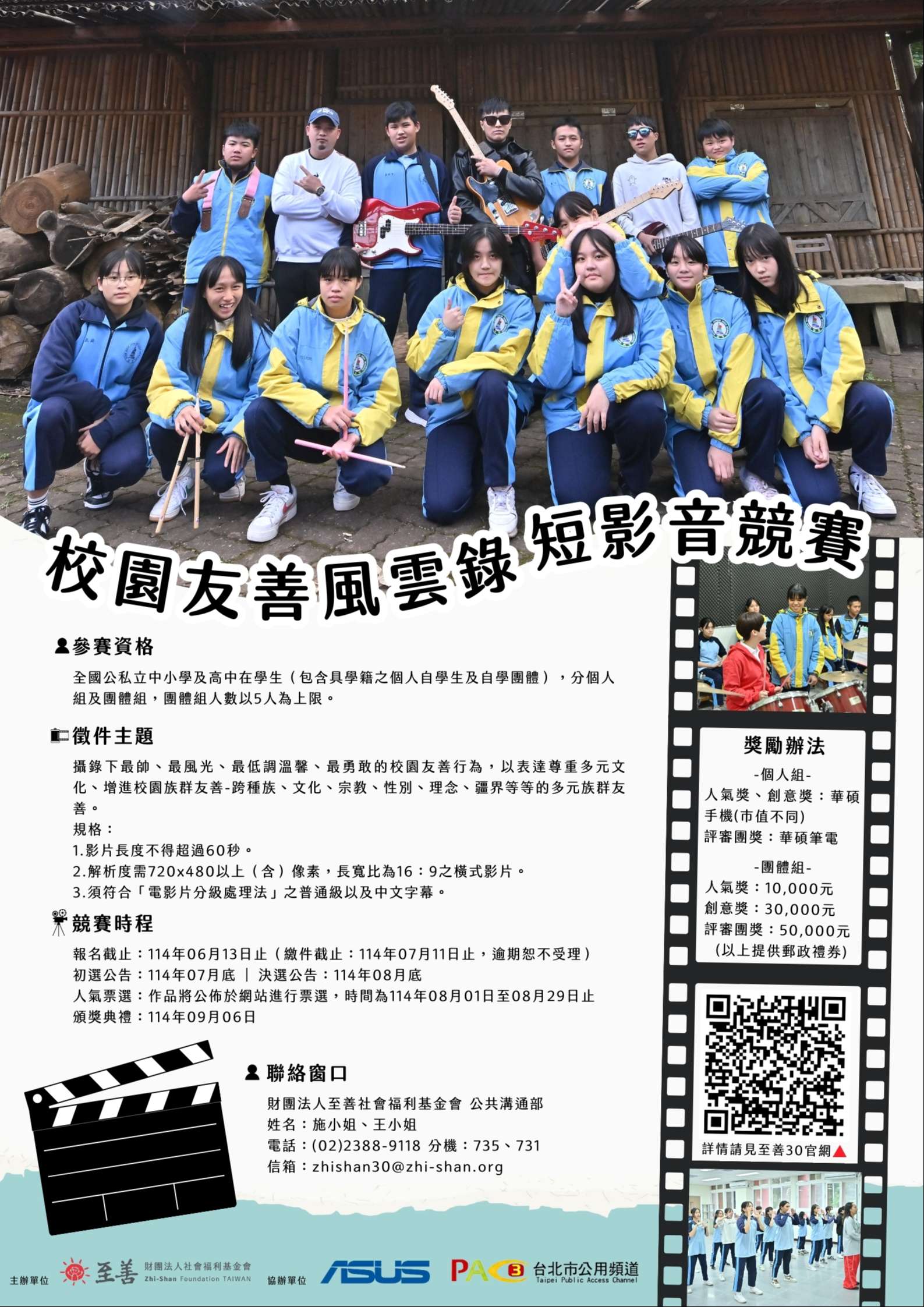 二、該基金會(官網:https://www.zhi-shan.org/)長期從事 亞洲4地兒少發展工作,為響應「兒童權利公約」(CRC) 中禁止歧視原則,自2023年起倡議「校園族群友善」,已 連續兩年舉辦校園族群友善獎。該會將辦理「校園友善風 雲錄-短影音競賽」,邀請全國國小至高中學生共同參 與,促進校園友善。