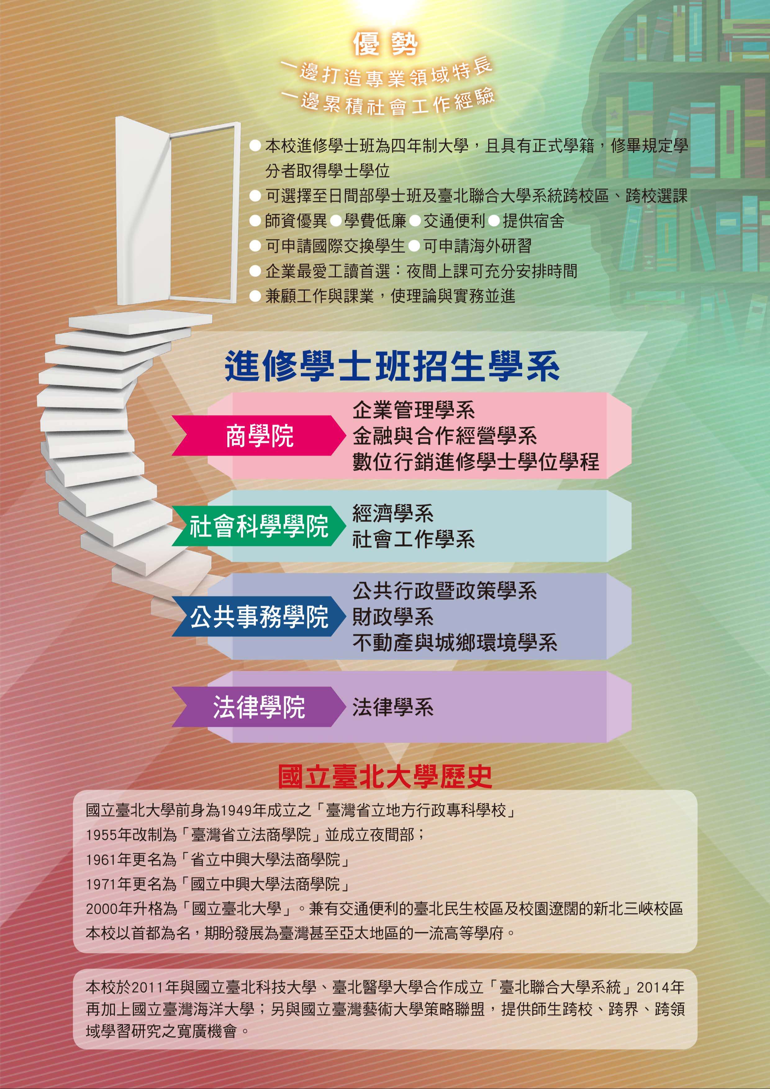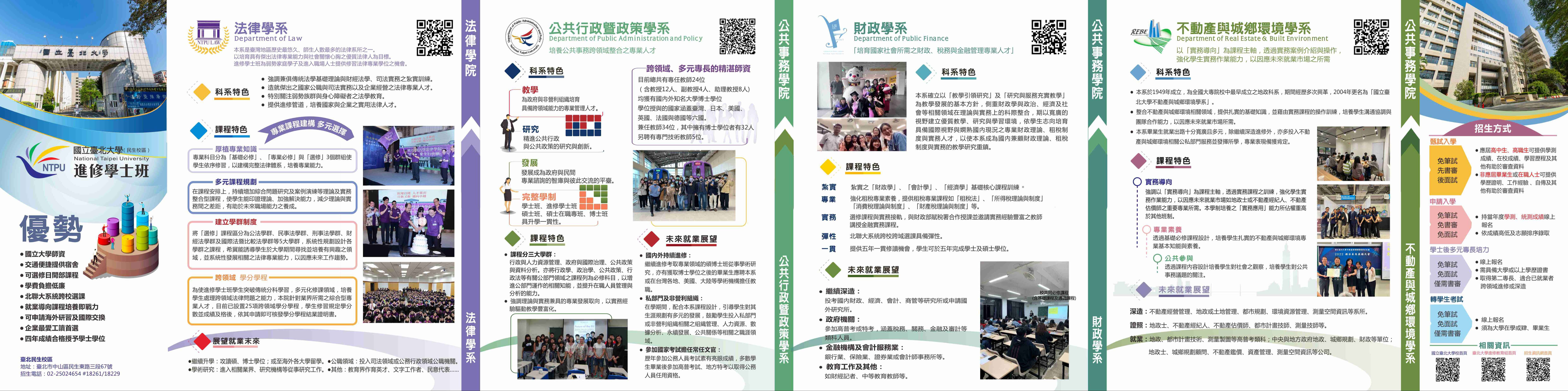 (二)公共事務學院:公共行政暨政策學系、財政學系、不動產與城鄉環境學系。