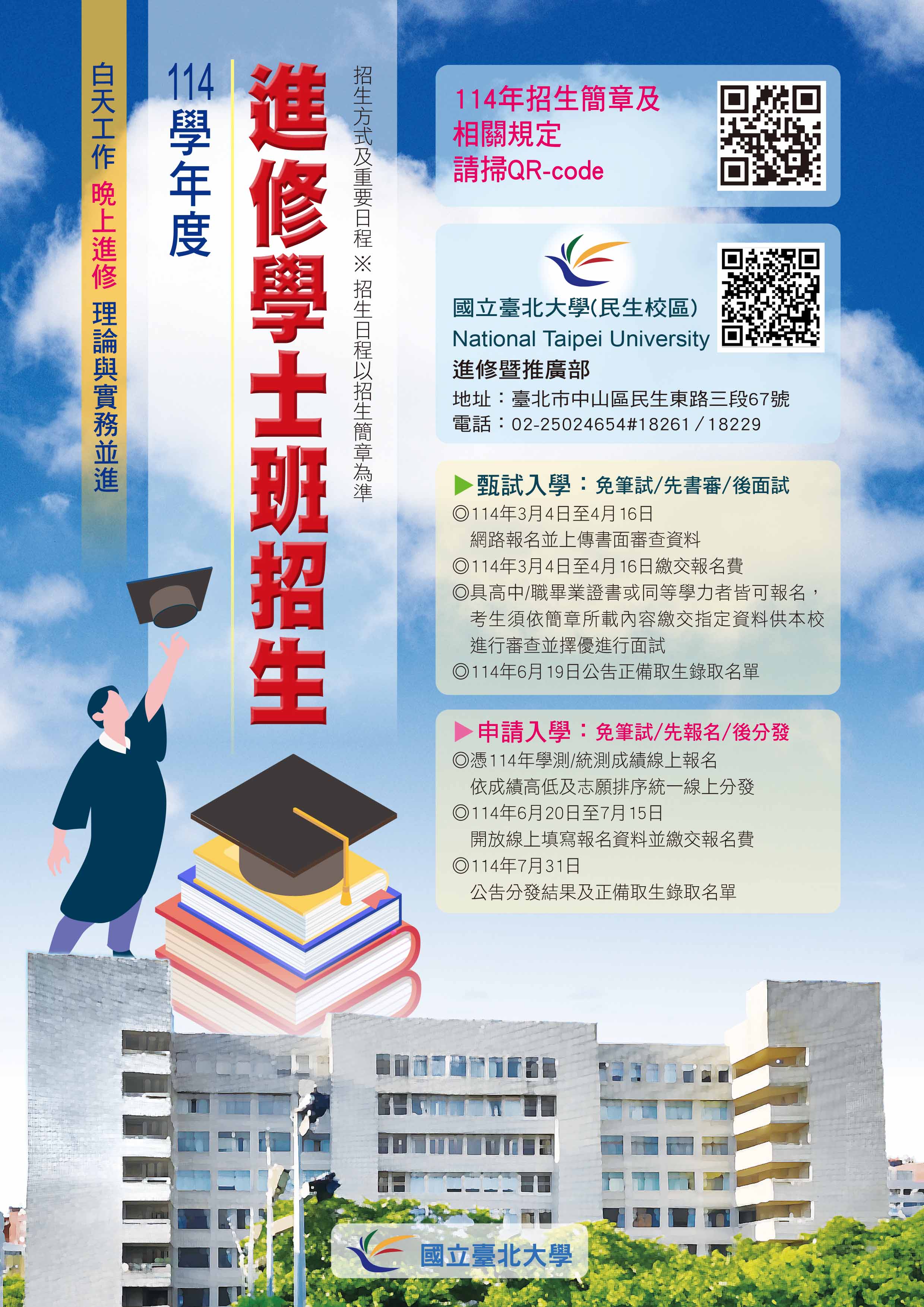 主旨:檢送本校114學年度進修學士班招生簡章及招生DM,敬請公告周知並鼓勵所屬人員報考。